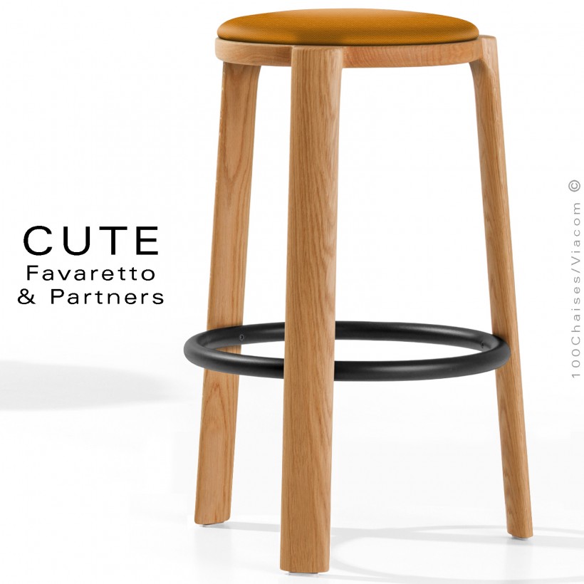 Tabouret de bar design CUTE, en Chêne massif vernis naturel, assise garnie, tissu couleur orange pour intérieur.