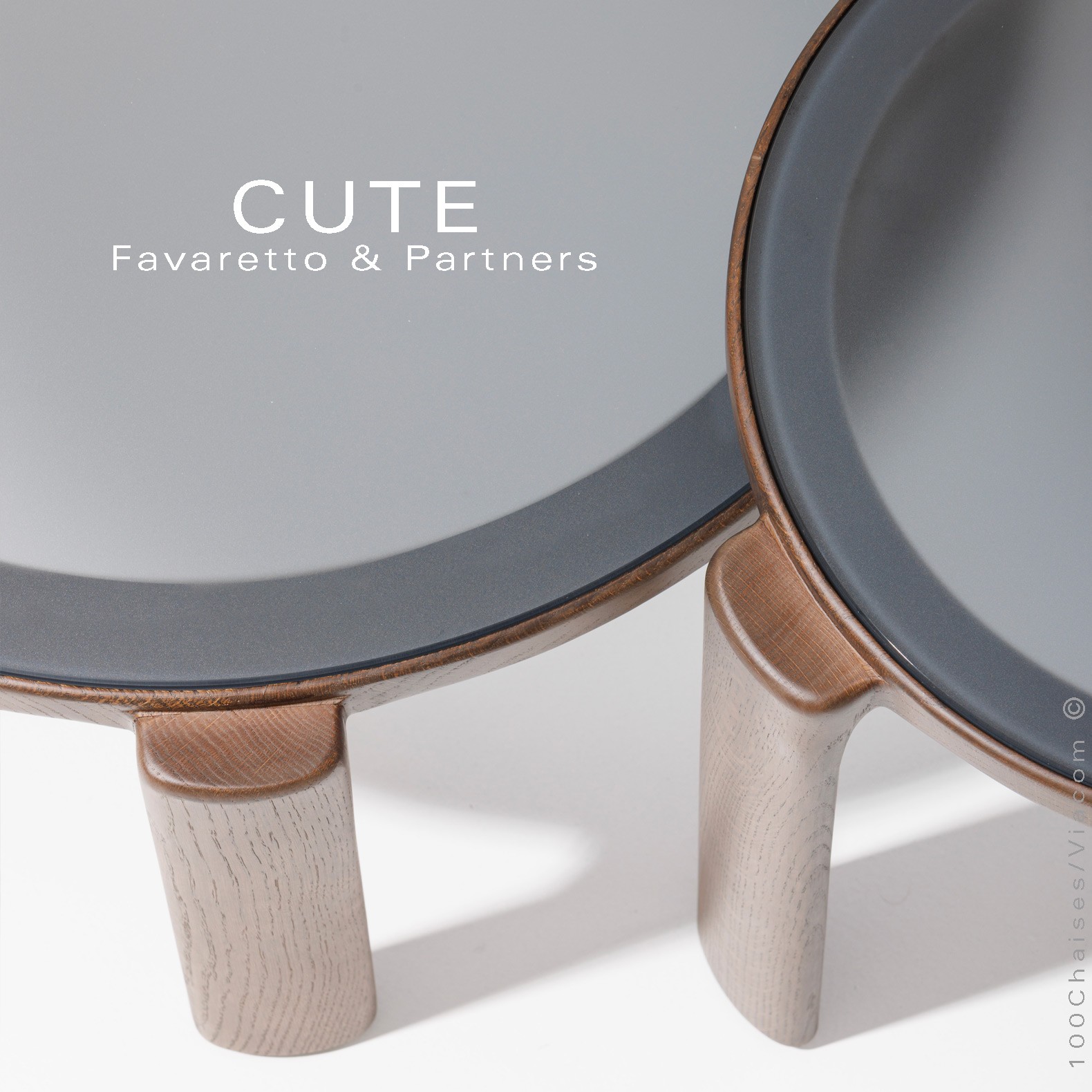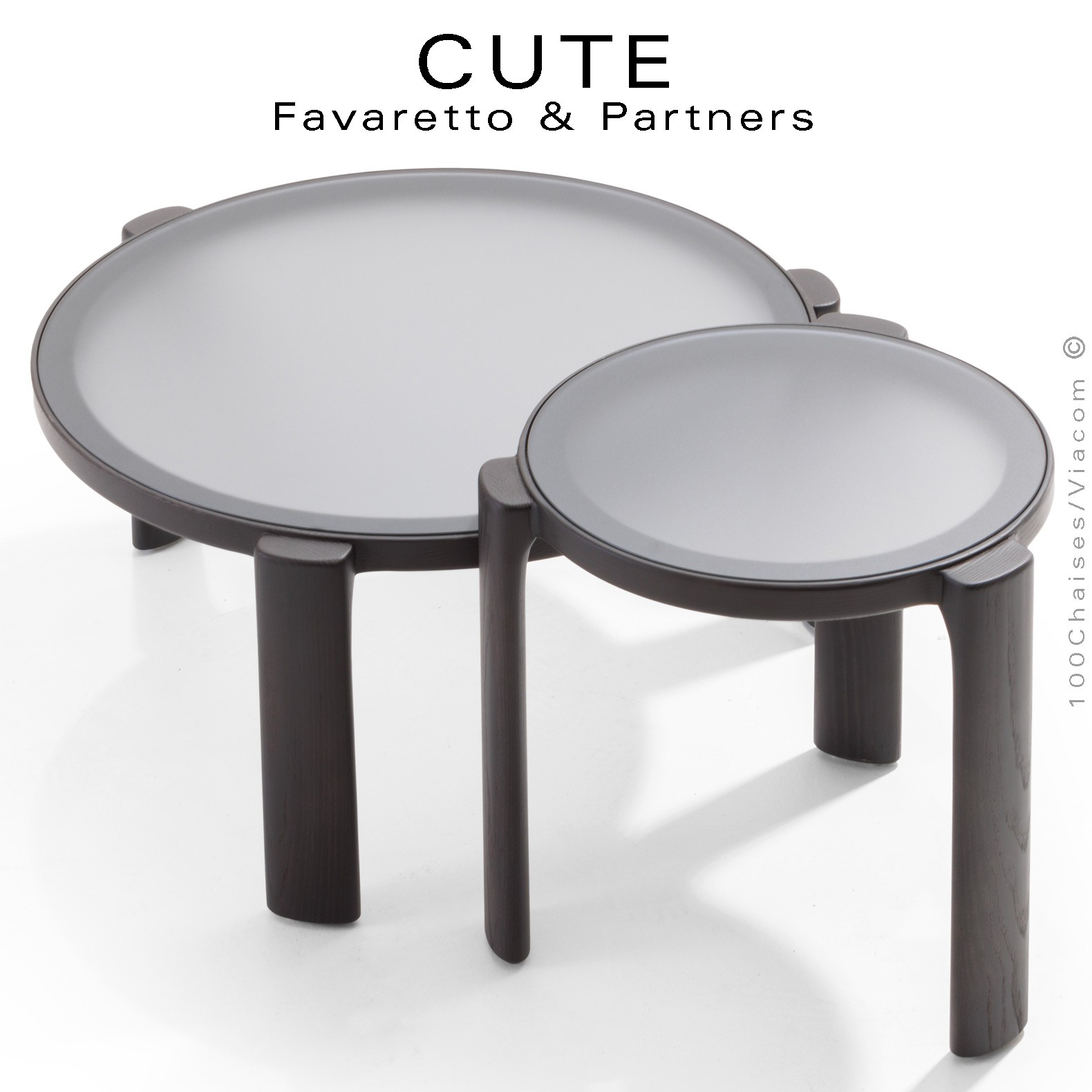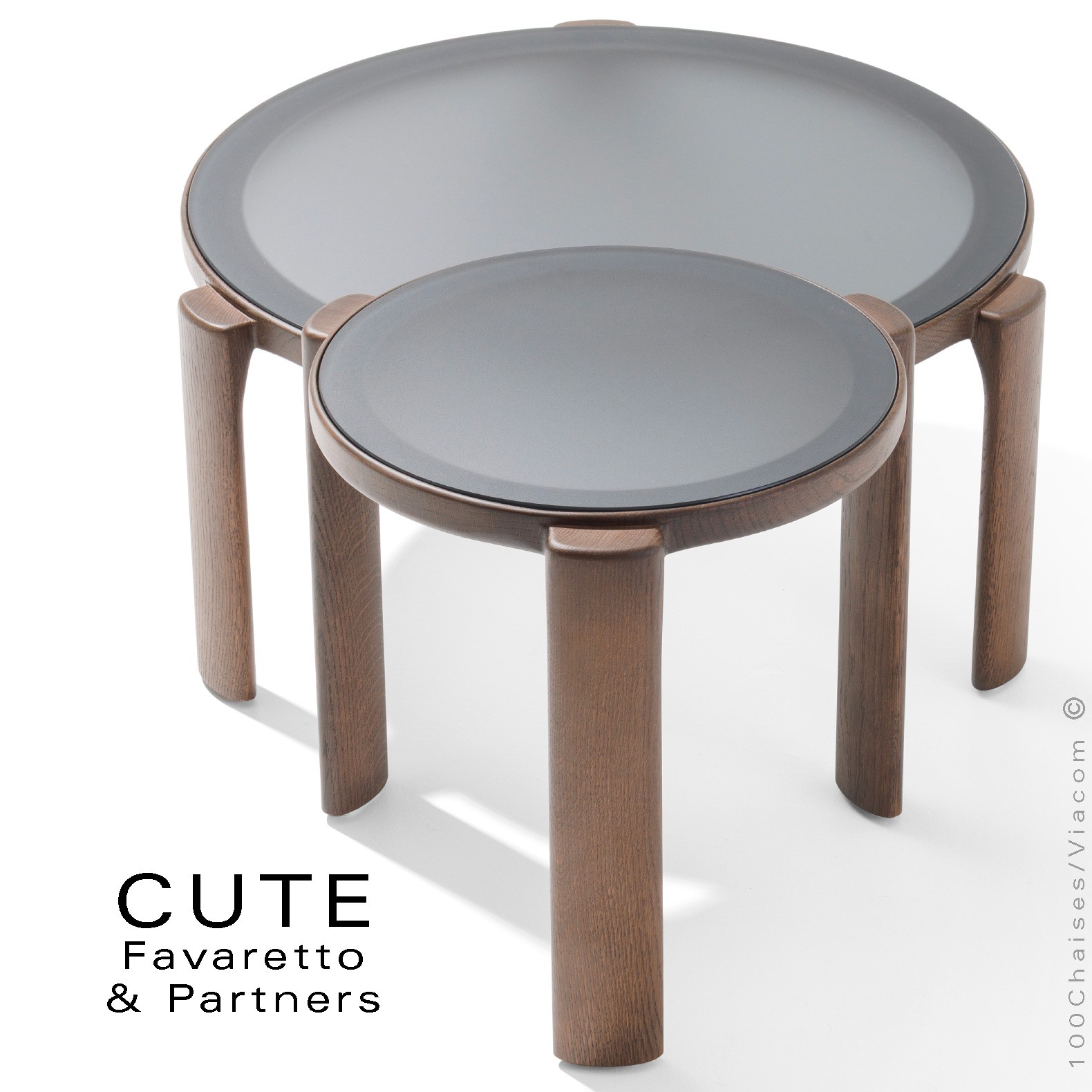 Table basse ronde design CUTE, structure bois massif de Frêne, Chêne ou noyer vernis, plateau verre blanc ou gris dépoli.
