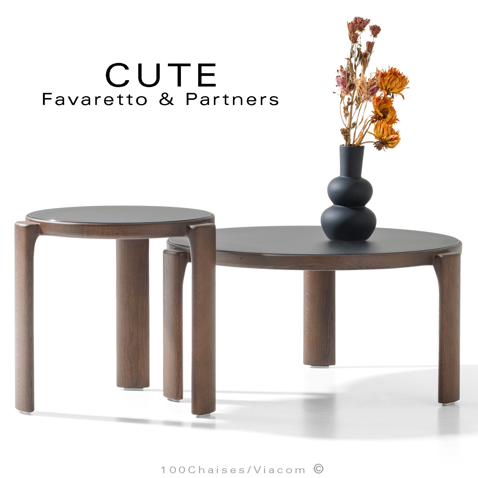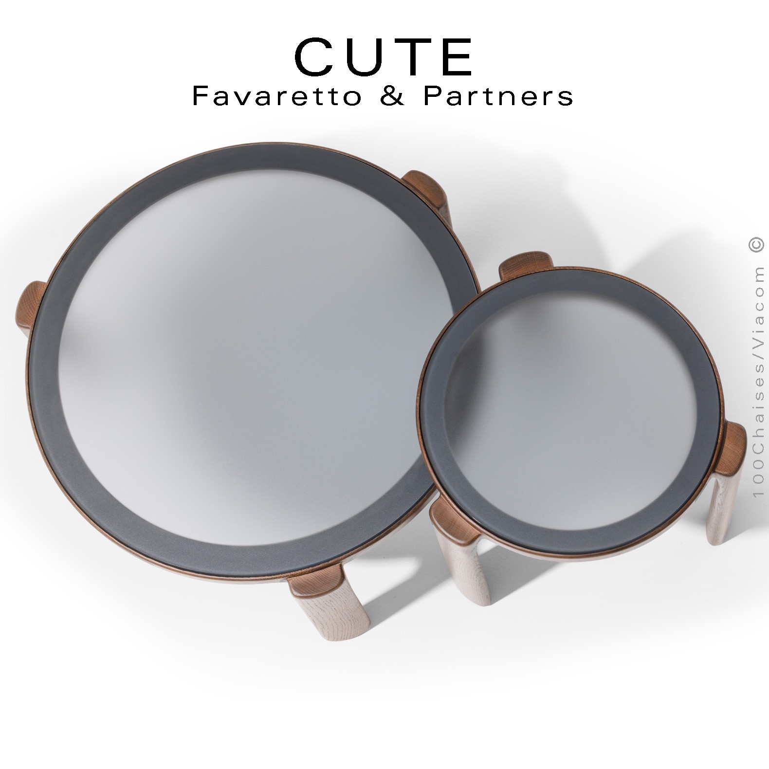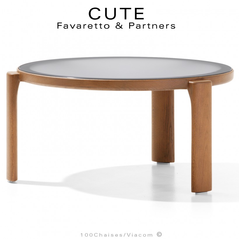 Table basse ronde design CUTE, structure bois massif de Frêne, Chêne ou noyer vernis, plateau verre blanc ou gris dépoli.