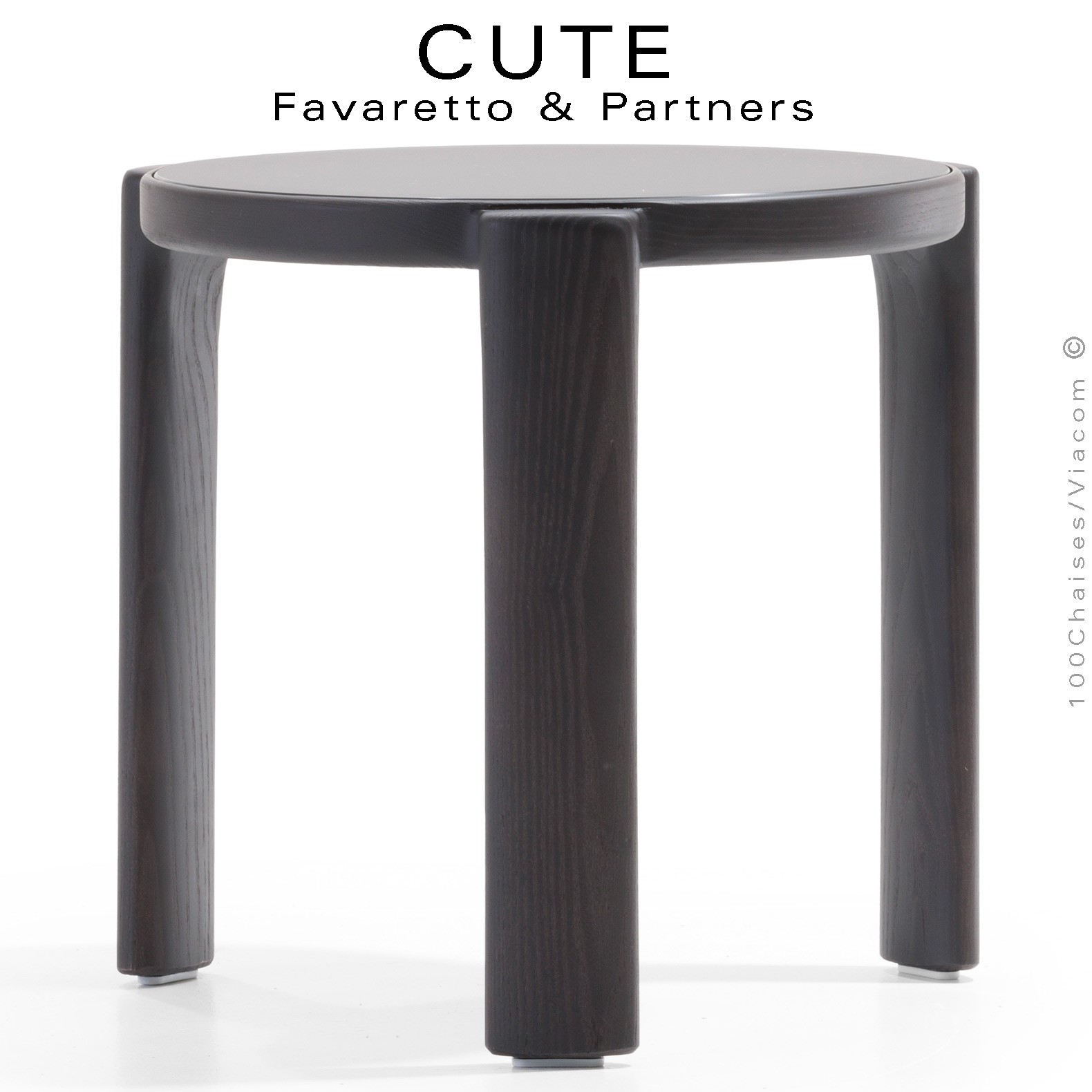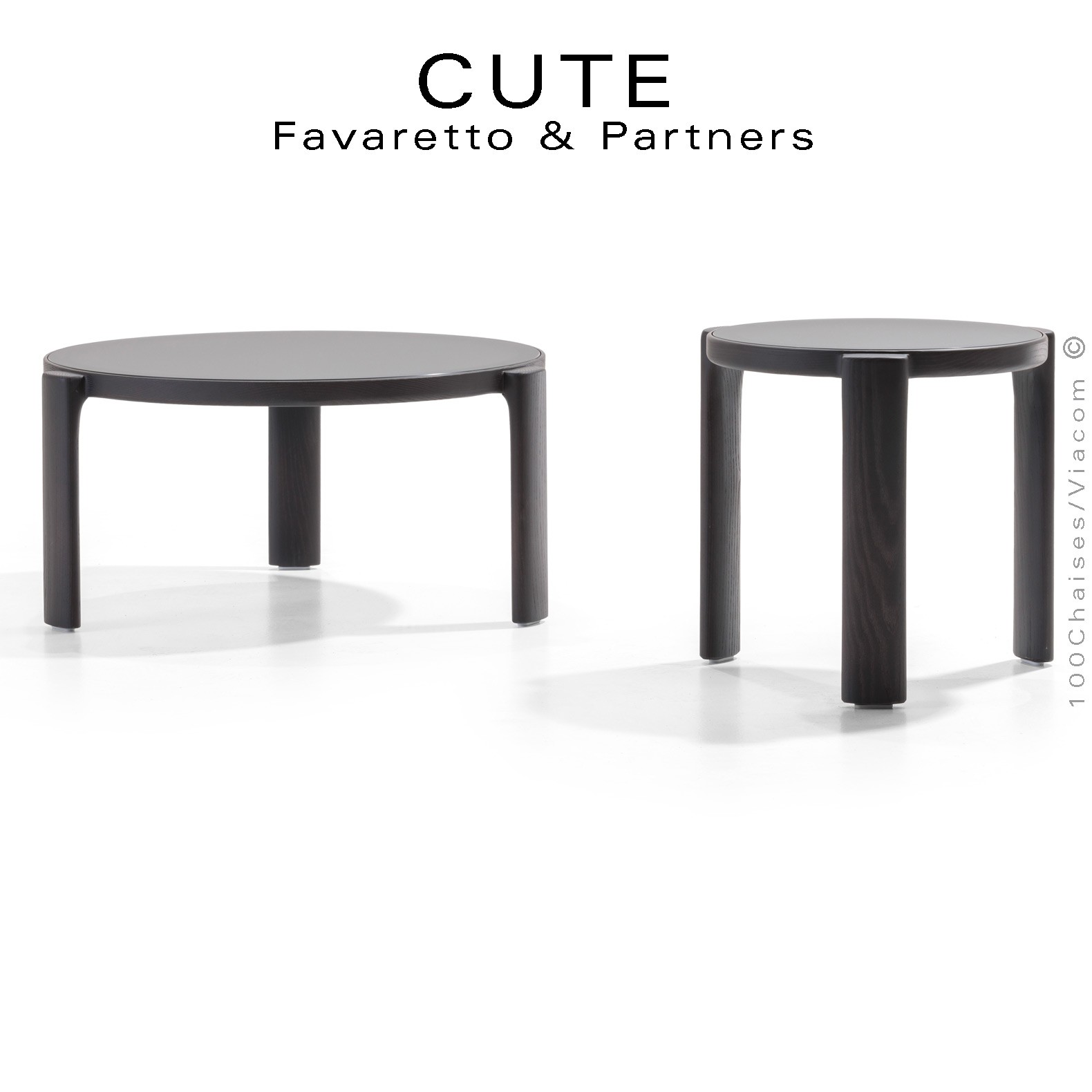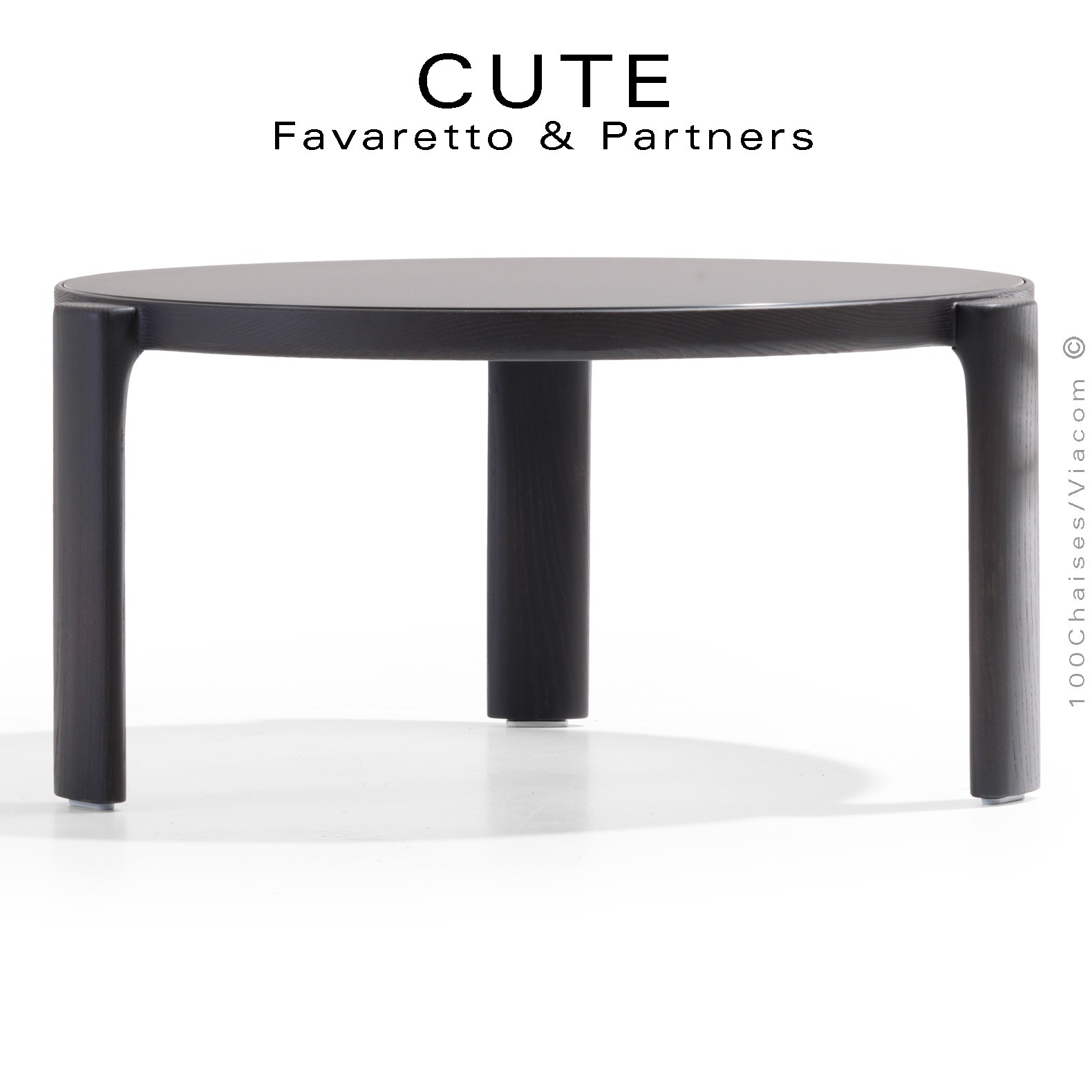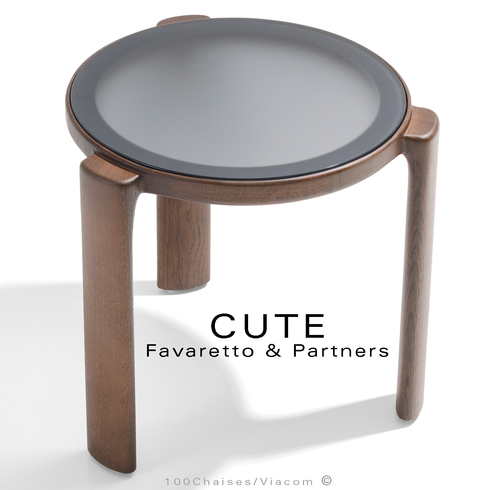 Table basse ronde design CUTE, structure trois pieds bois massif de Frêne, Chêne ou Noyer vernis naturel ou foncé au choix suivant palette fabricant. La structure bois peut-être livré peinte sur demande (voir gamme fabricant). Plateau rond en verre extra-blanc ou gris dépoli à l'acide. Dimension plateau diamètre Ø60 cm. pour une hauteur de 30 cm.