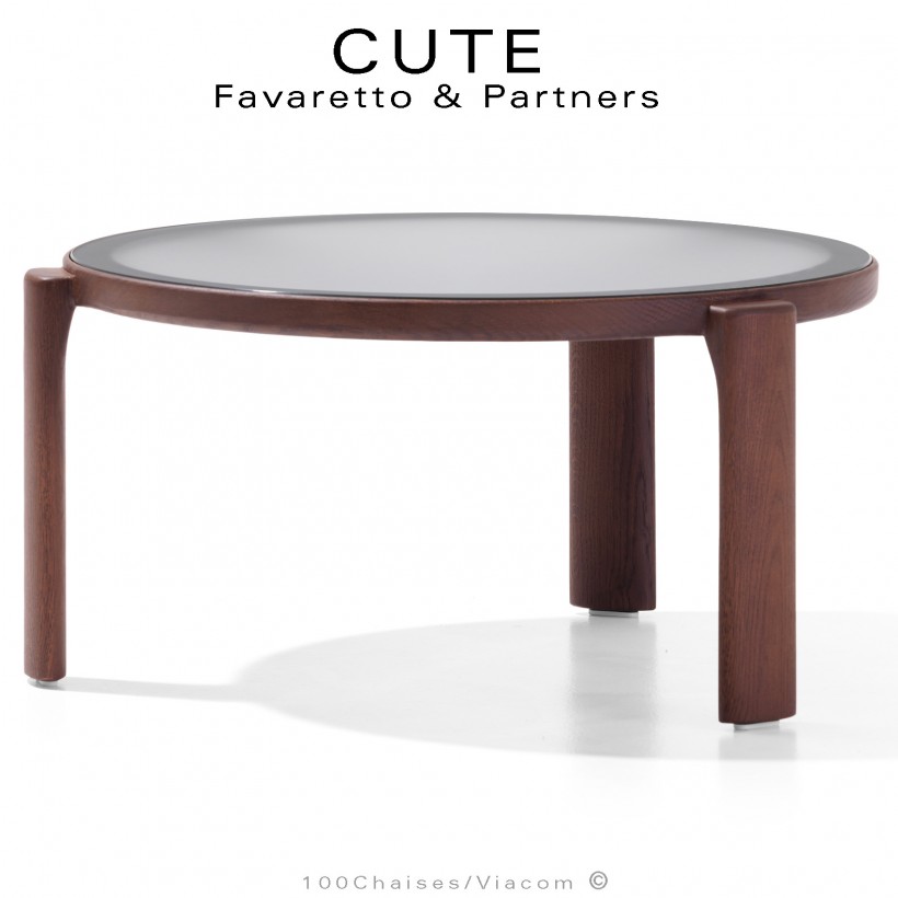 Table basse ronde design CUTE, structure bois massif de Frêne, Chêne ou noyer vernis, plateau verre blanc ou gris dépoli.