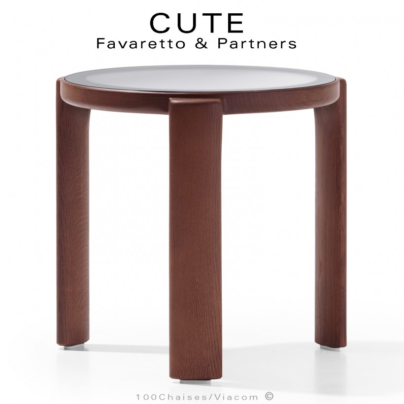 Petite table basse ronde design CUTE, structure trois pieds bois massif de Frêne, Chêne ou Noyer vernis naturel ou foncé au choix suivant palette fabricant. La structure bois peut-être livré peinte sur demande (voir gamme fabricant). Plateau rond en verre extra-blanc ou gris dépoli à l'acide. Dimension plateau diamètre Ø40 cm. pour une hauteur de 37 cm.