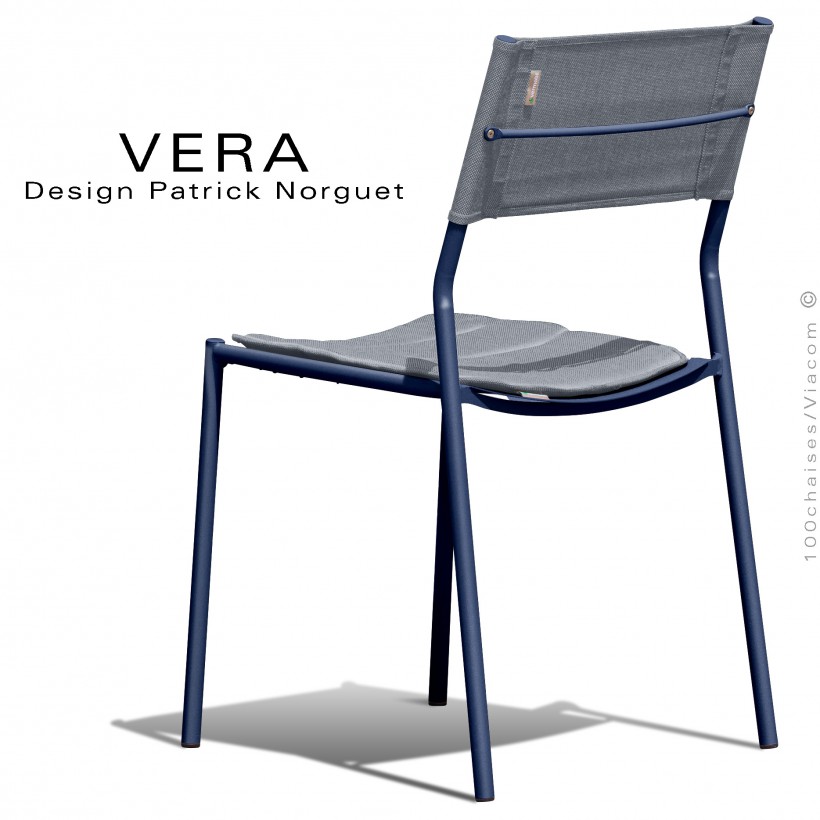 Chaise repas d'extérieur VERA, structure acier galvanisé peint bleu foncé, dossier tissu technique Batyline bleu ice.