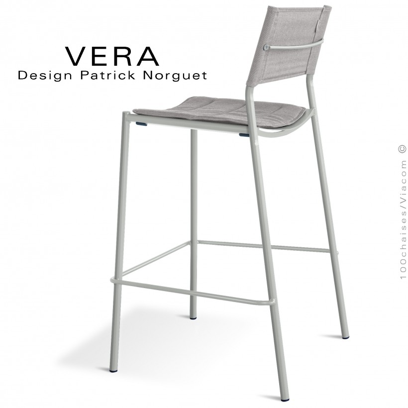 Tabouret de bar d'extérieur VERA, structure acier galvanisé peint blanc perle, dossier tissu Batyline Tourterelle avec coussin.