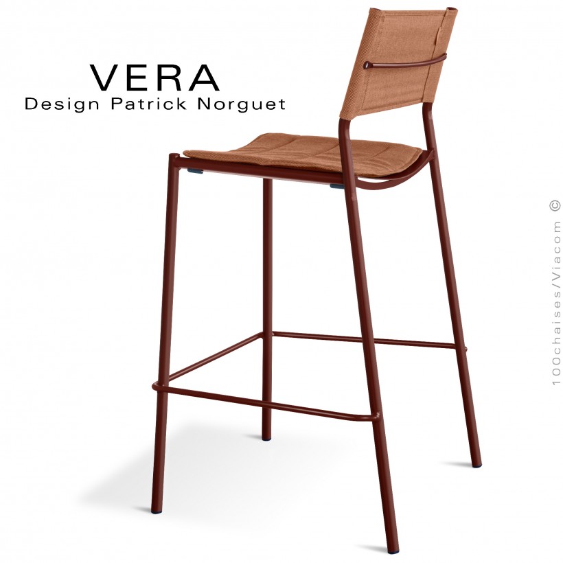 Tabouret de bar d'extérieur VERA, structure acier galvanisé peint Terracotta, dossier tissu Batyline orange avec coussin.