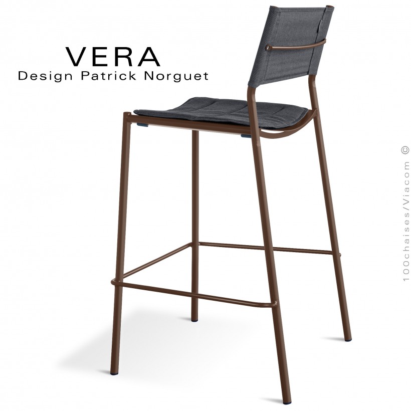 Tabouret de bar d'extérieur VERA, structure acier galvanisé peint Corten, dossier tissu Batyline argent avec coussin.