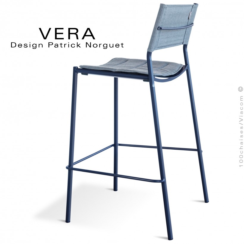 Tabouret de bar d'extérieur VERA, structure acier galvanisé peint bleu nuit, dossier tissu Batyline bleu clair avec coussin.