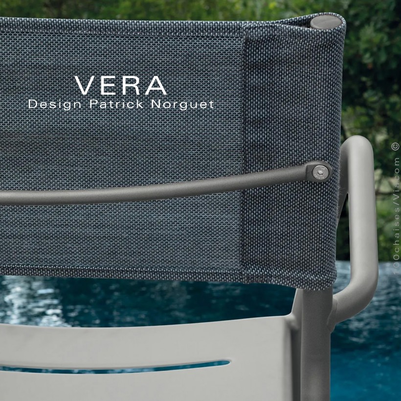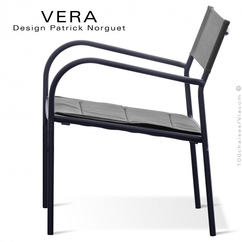 Le fauteuil lounge salon d'extérieur empilable avec accoudoirs VERA est une véritable petite merveille ! Conçue par le talentueux designer Patrick Norguet, il est un bijou d'ingénierie qui répond aux besoins du marché de l'outdoor avec une simplicité et une élégance époustouflantes. Son design épuré, est un véritable chef-d'œuvre. Ce fauteuil à la silhouette élégante et intemporelle, à la structure tubulaire, et son assise en métal perforé, pour en faire un meuble élégant, nous l'avons agrémenté d'un coussin capitonné au dimensions 580x510 mm., avec aimant d'un épaisseur de 15 mm. de mousse polyuréthane (en option normalement), mais vendu avec le fauteuil. Pour le dossier celui-ci est en tissu technique BATYLINE pour plus de confort. Six combinaisons de couleurs disponibles.