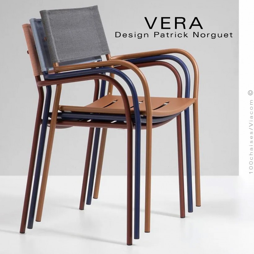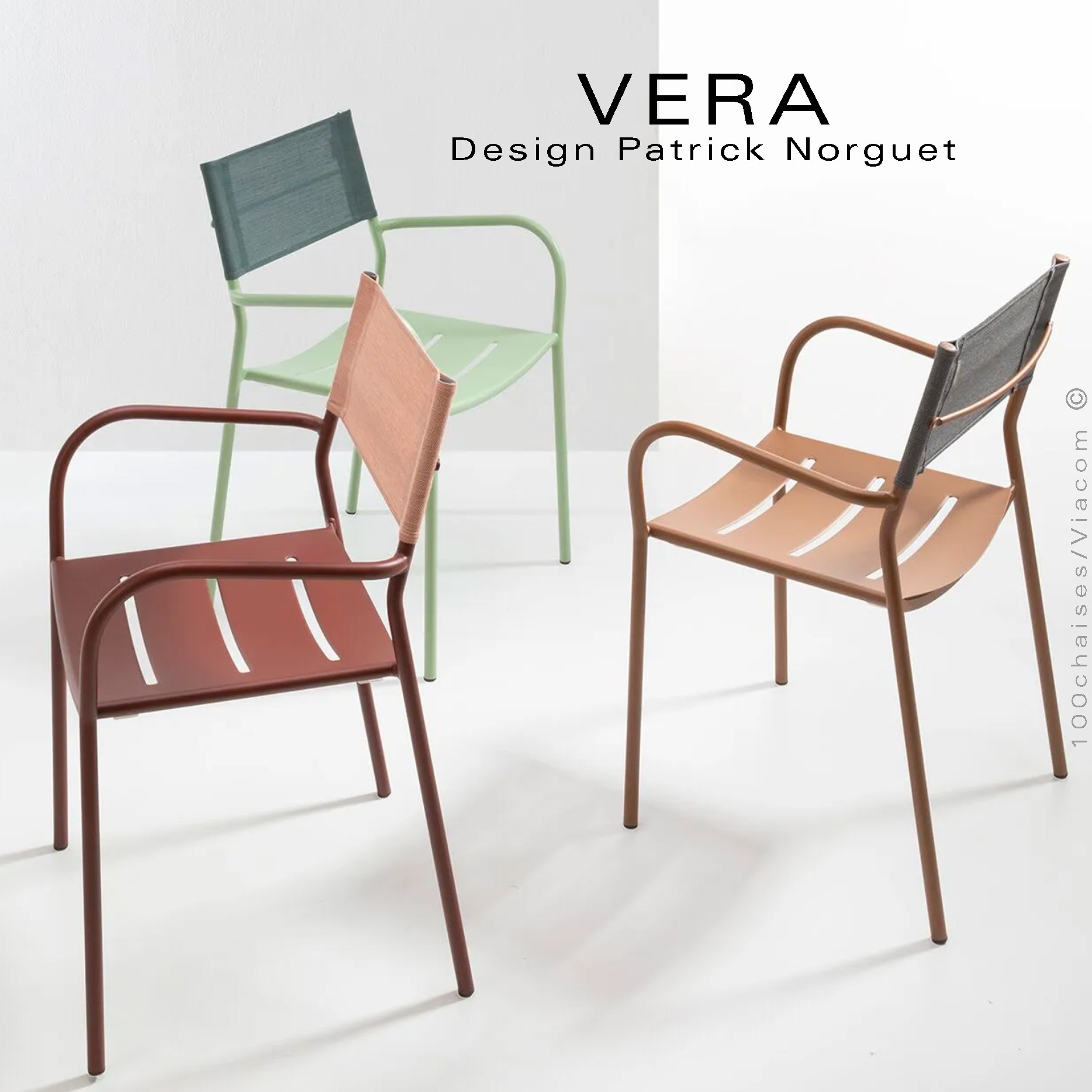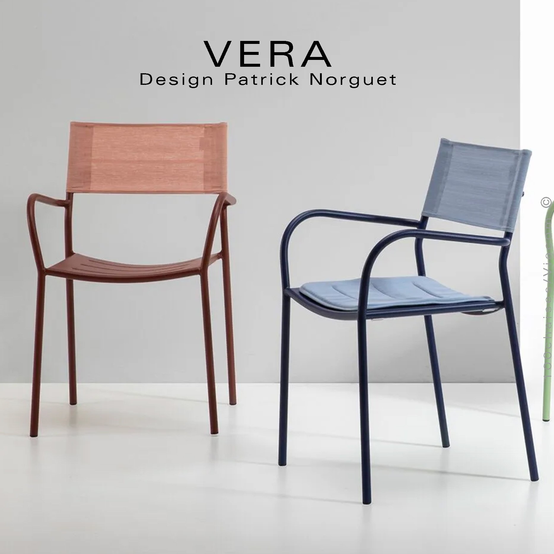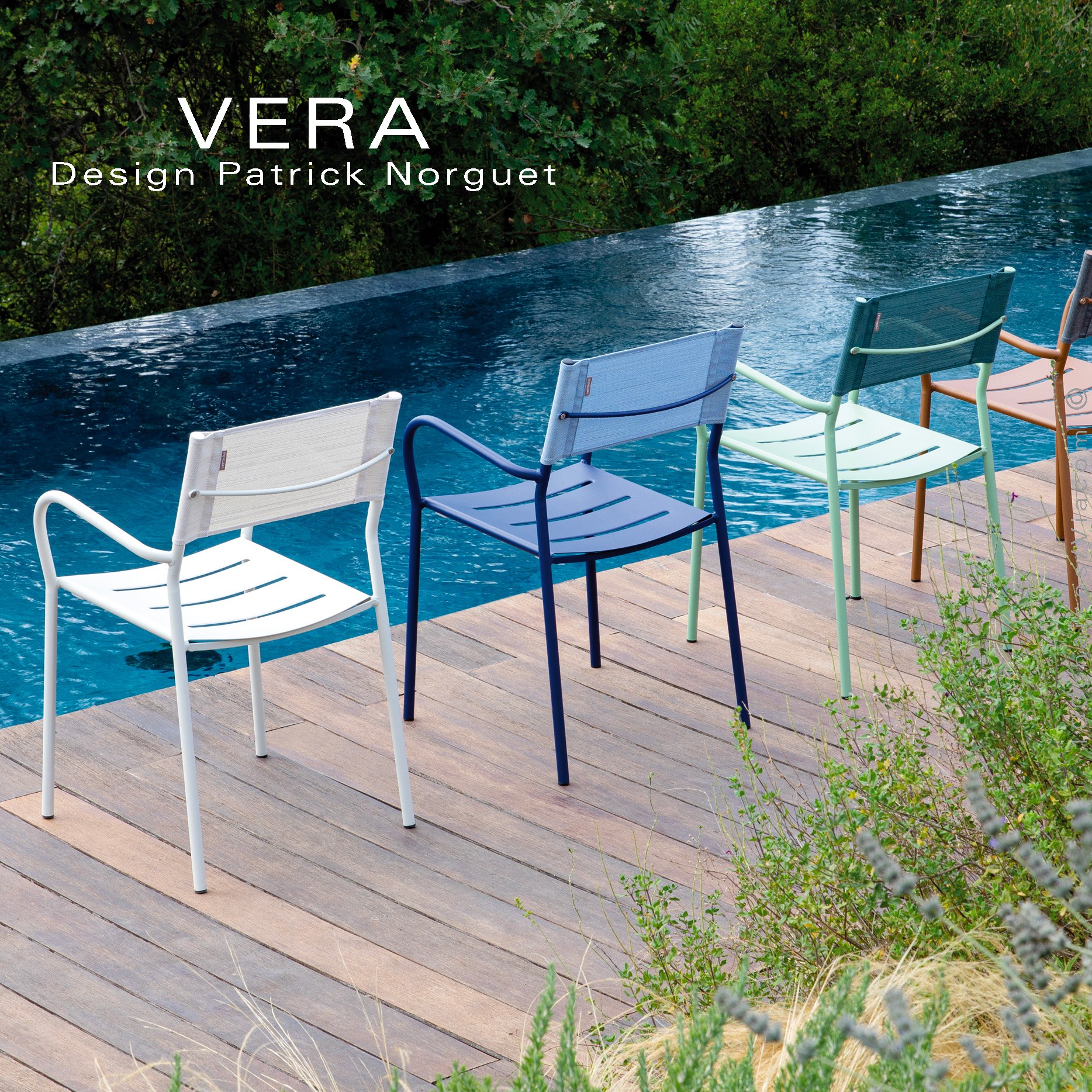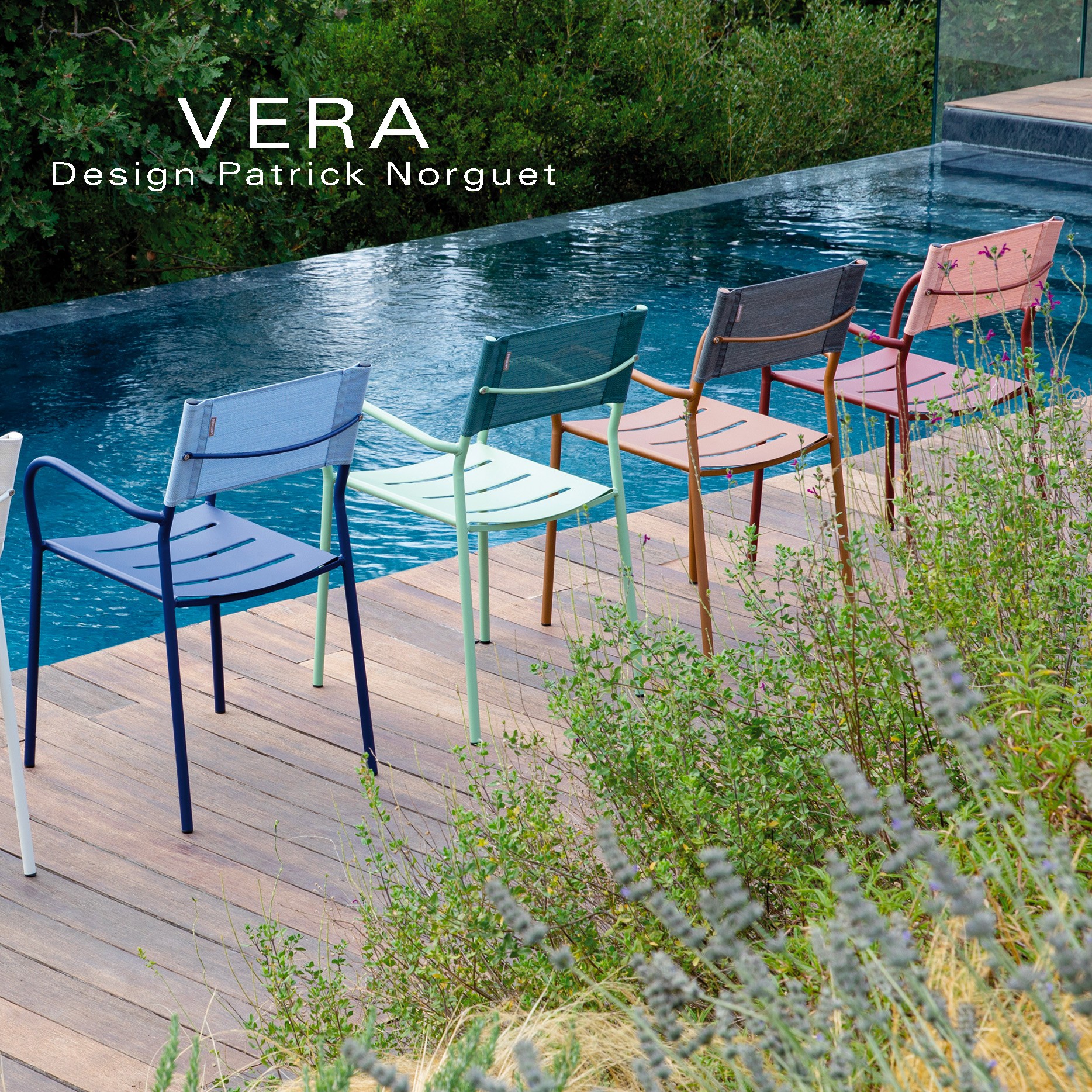 Le fauteuil lounge salon d'extérieur empilable avec accoudoirs VERA est une véritable petite merveille ! Conçue par le talentueux designer Patrick Norguet, il est un bijou d'ingénierie qui répond aux besoins du marché de l'outdoor avec une simplicité et une élégance époustouflantes. Son design épuré, est un véritable chef-d'œuvre. Ce fauteuil à la silhouette élégante et intemporelle, à la structure tubulaire, et son assise en métal perforé, pour en faire un meuble élégant, nous l'avons agrémenté d'un coussin capitonné au dimensions 580x510 mm., avec aimant d'un épaisseur de 15 mm. de mousse polyuréthane (en option normalement), mais vendu avec le fauteuil. Pour le dossier celui-ci est en tissu technique BATYLINE pour plus de confort. Six combinaisons de couleurs disponibles.