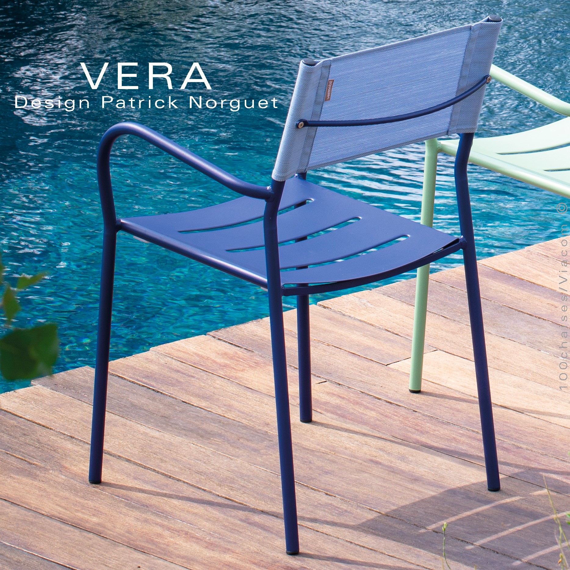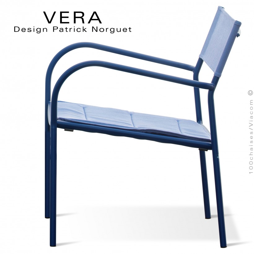 Fauteuil salon d'extérieur VERA, structure acier galvanisé peint bleu nuit, dossier tissu Batyline bleu clair avec coussin.