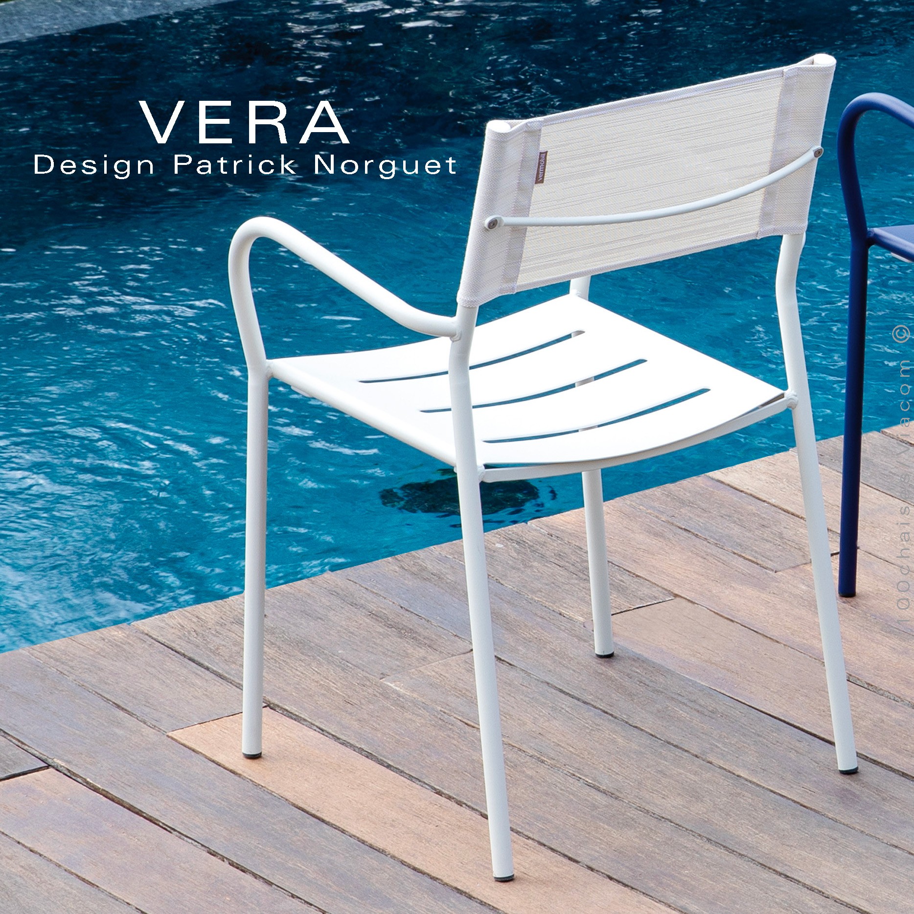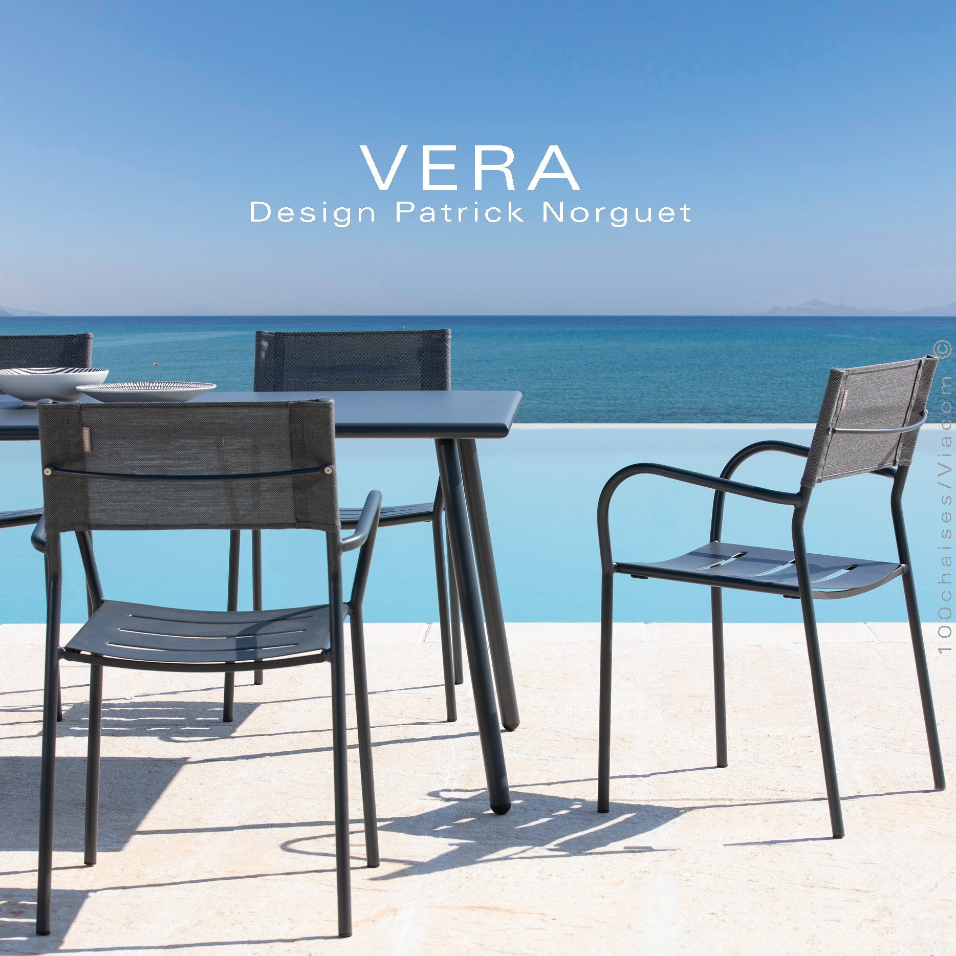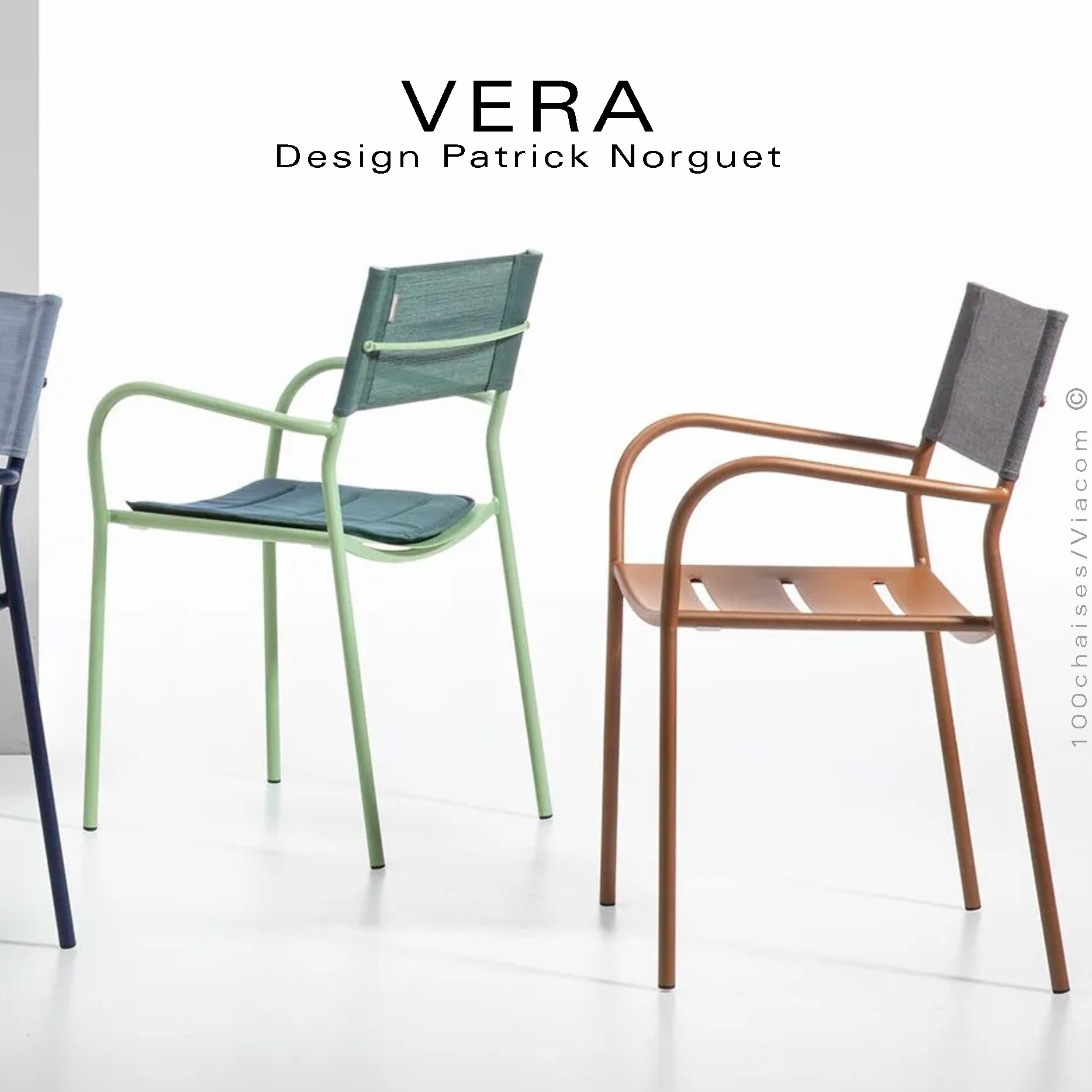 Fauteuil salon d'extérieur VERA, structure acier galvanisé peint, dossier tissu technique Batyline avec coussin.