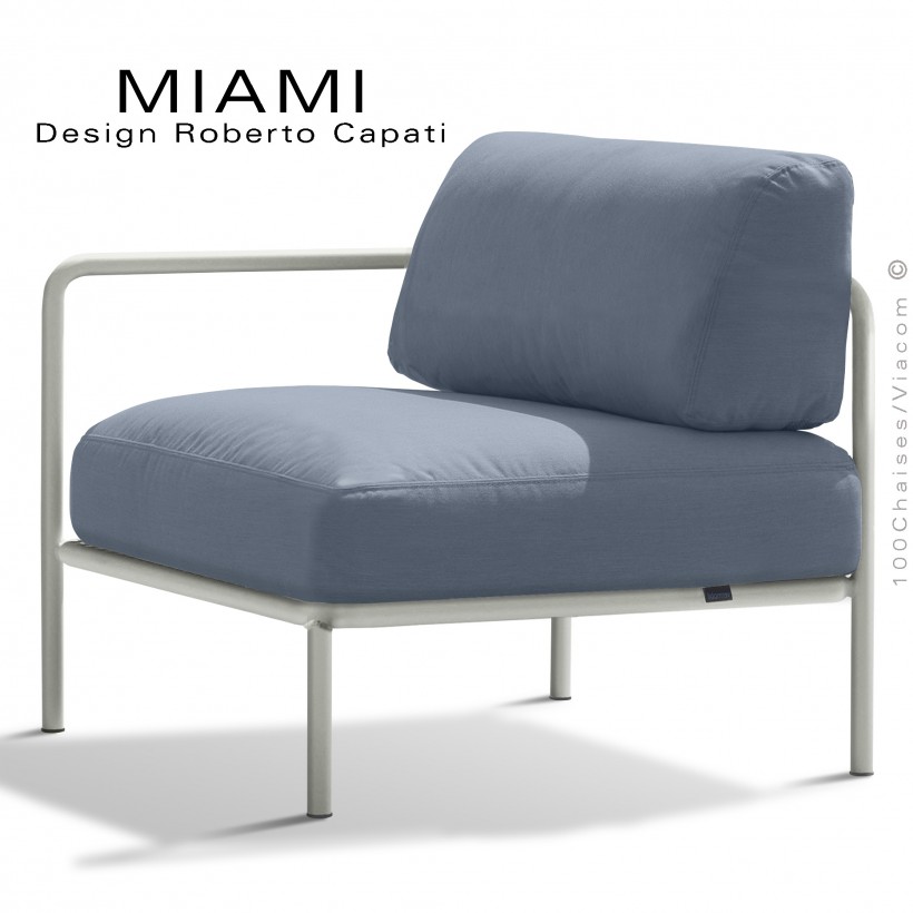 Fauteuil simple ou bout de banquette modulable gauche MIAMI, structure peinte blanc perle, assise tissu hydrofuge gris bleu.