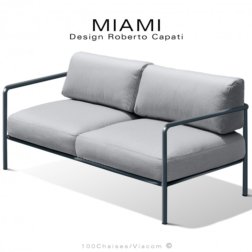 Banquette 2 places pour extérieur MIAMI, structure acier peinte anthracite, assise avec coussin, hydrofuge couleur argent.