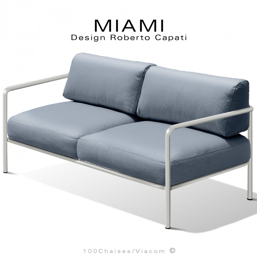 Banquette 2 places pour extérieur MIAMI, structure acier peinte blanc perle, assise avec coussin, hydrofuge couleur bleu gris.