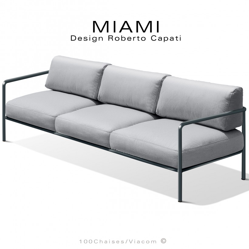 Banquette 3 places pour extérieur MIAMI, structure acier peinte anthracite, assise avec coussin, tissu couleur argent.