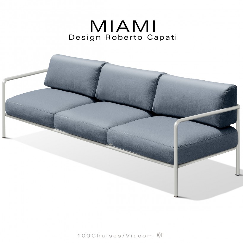 Banquette trois places pour extérieur MIAMI, structure acier galvanisée peinte, assise avec coussin, habillage tissu hydrofuge.