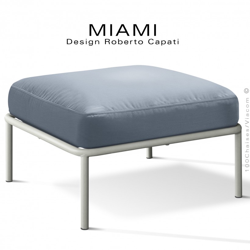 Pouf ou module banquette pour extérieur MIAMI, structure acier peint blanc perle, assise coussin tissu couleur bleu.
