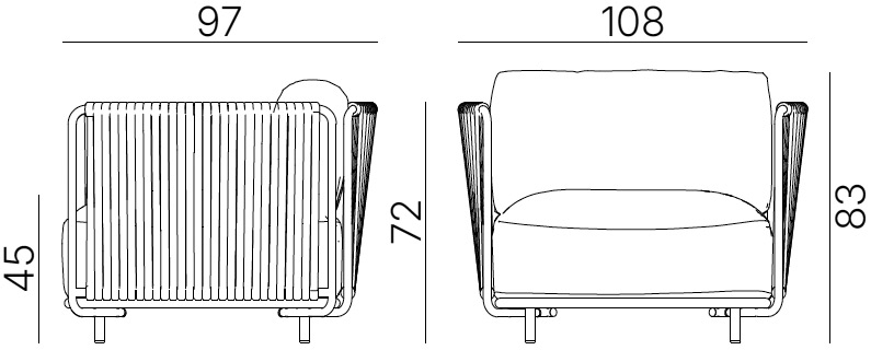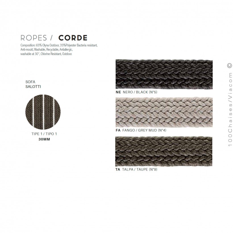 L'assise confort avec ceinture élastique, est équipée de deux coussins rembourrés offrant un confort supérieur, l'assise est parfait pour les moments de détente en plein air. L'habillage sous forme de housses sont entièrement déhoussables, dans la gamme supérieur de tissu AVANT-GARDE, composition 100% polypropylène, traitement anti U.V., et hydrofuge, ce qui facilite l'entretien et le nettoyage pour un aspect toujours frais et soigné. Les accoudoirs de la structure reçoive une habillage tressage corde marine, couleurs aux choix, crème, taupe ou noir.