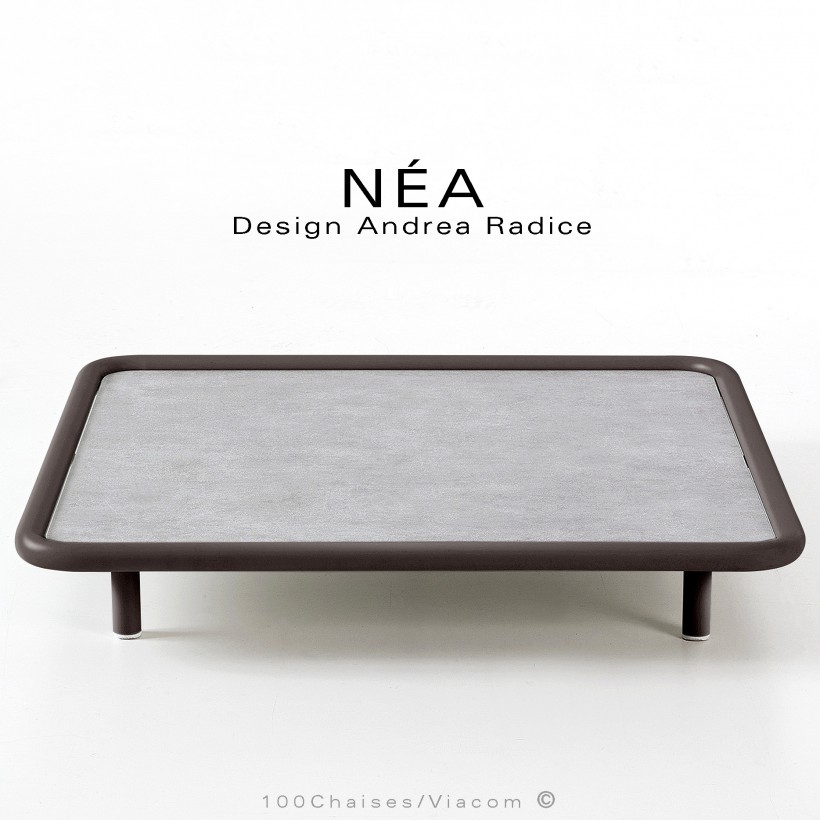 Table basse carrée d'extérieur NÉA, structure acier galvanisé peint bronze, plateau stratifié HP, aspect ciment.