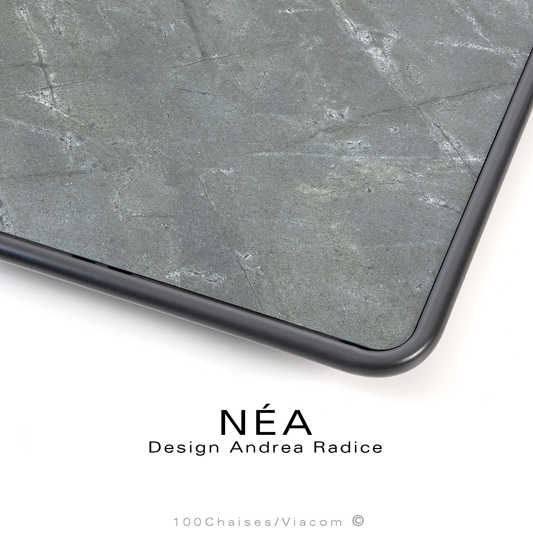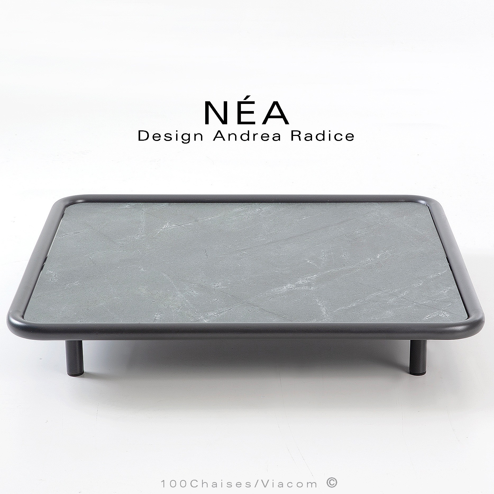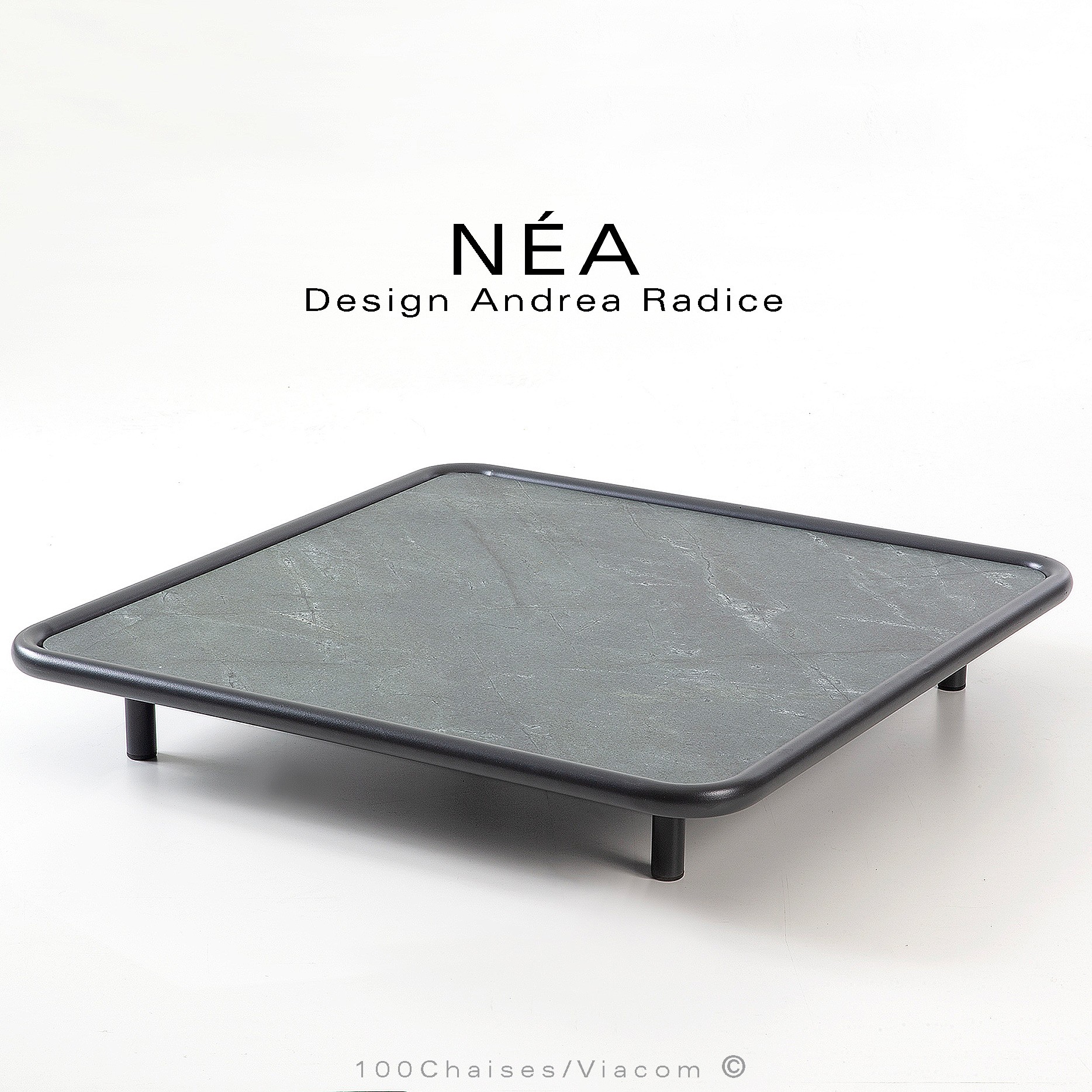 Table basse carrée pour salon lounge d'extérieur NÉA, structure acier galvanisé peint, plateau stratifié HP, aspect matière.