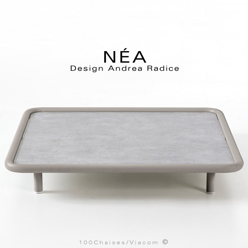 Table basse carrée d'extérieur NÉA, structure acier galvanisé peint gris Tourterelle, plateau stratifié HP, aspect ciment.