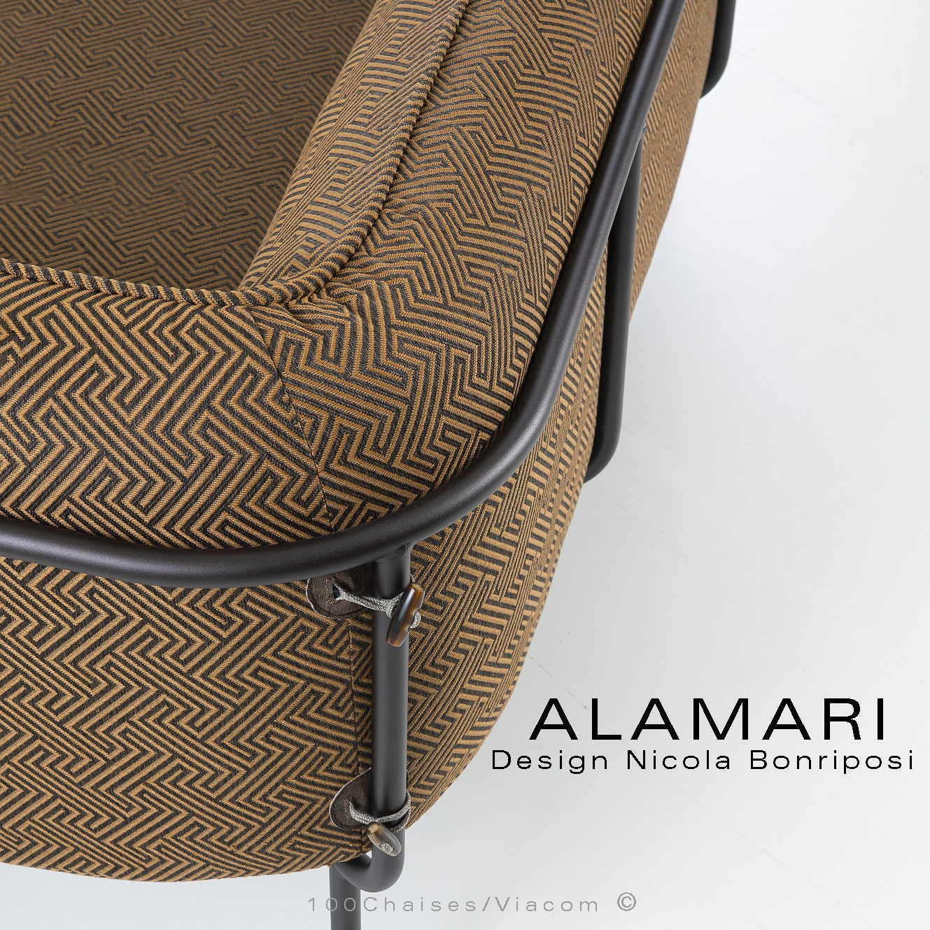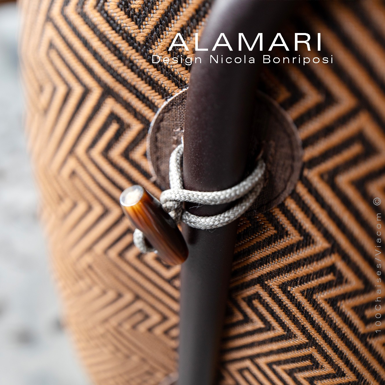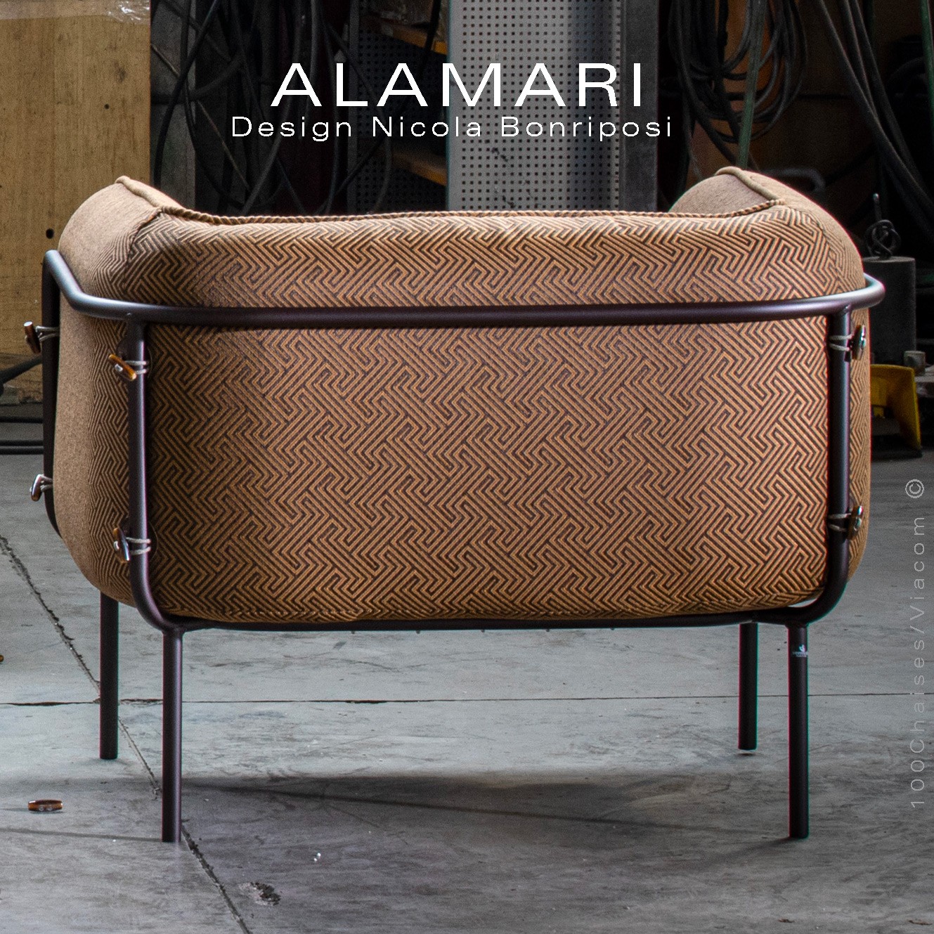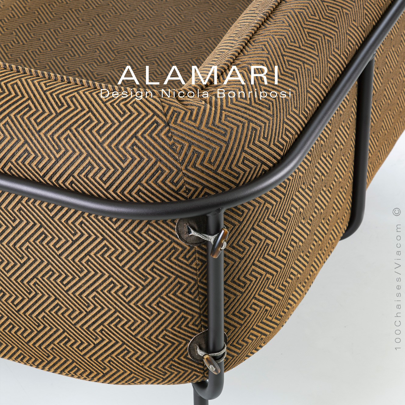 Salon d'extérieur pour jardin ou fauteuil large lounge ALAMARI, structure tube d'acier 30 mm., avec tampons plastique de protection des sols. Finition structure, peint avec des poudres polyester thermodurcissables Qualicoat de classe 1 et 2., couleurs standard bronze ou blanc perle (autre sur commande et devis voir palette fabricant). Assise avec ceinture élastique, coussins inclus assise et dossier enduits à l'intérieur d'une couche de PVC, ce qui le rend imperméable, tout en laissant respirer la mousse polyuréthane haute densité intérieur, afin de lutter contre la formation de moisissures. Option possible coussin supplémentaire (sur demande à commandes@100chaises.fr).