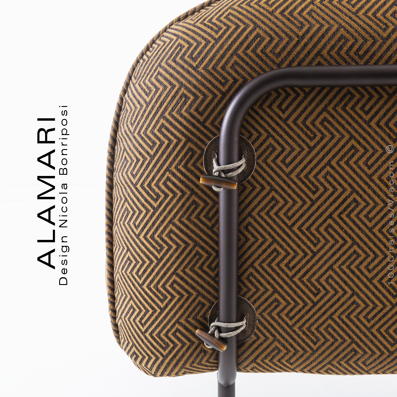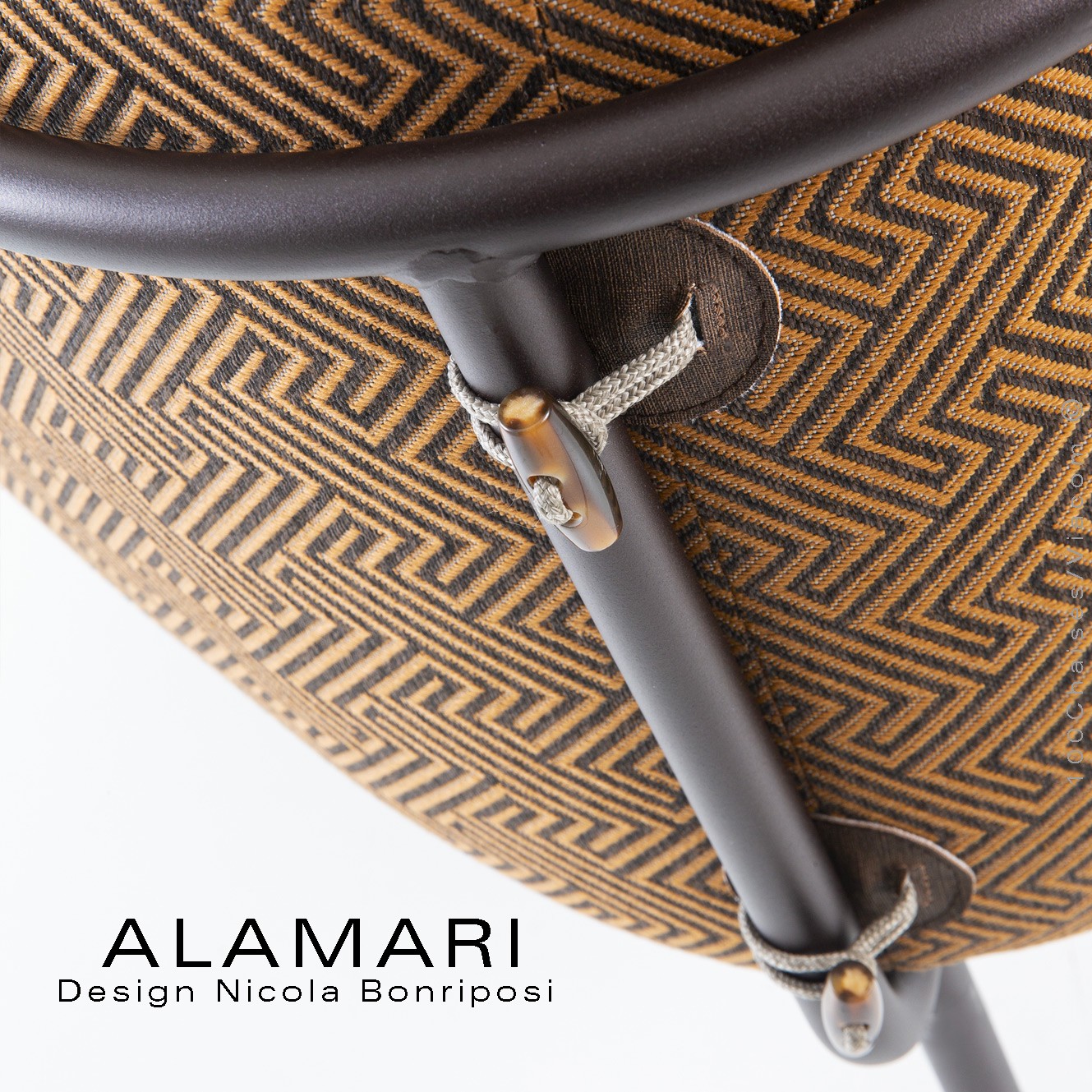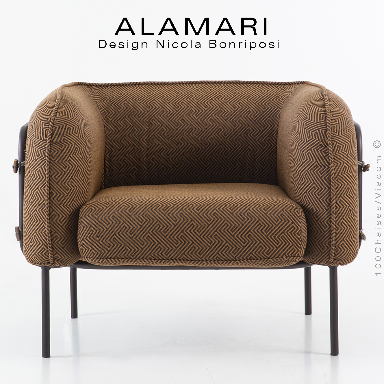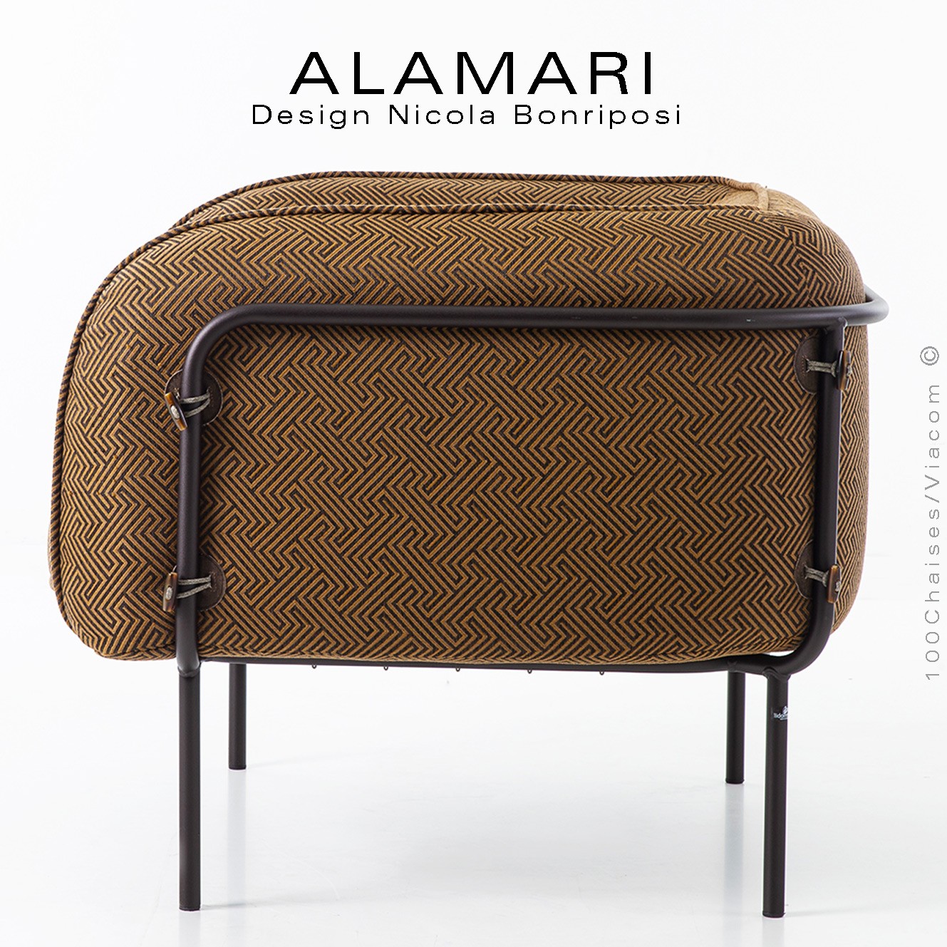 Salon d'extérieur pour jardin ou fauteuil large lounge ALAMARI, structure tube d'acier 30 mm., avec tampons plastique de protection des sols. Finition structure, peint avec des poudres polyester thermodurcissables Qualicoat de classe 1 et 2., couleurs standard bronze ou blanc perle (autre sur commande et devis voir palette fabricant). Assise avec ceinture élastique, coussins inclus assise et dossier enduits à l'intérieur d'une couche de PVC, ce qui le rend imperméable, tout en laissant respirer la mousse polyuréthane haute densité intérieur, afin de lutter contre la formation de moisissures. Option possible coussin supplémentaire (sur demande à commandes@100chaises.fr).