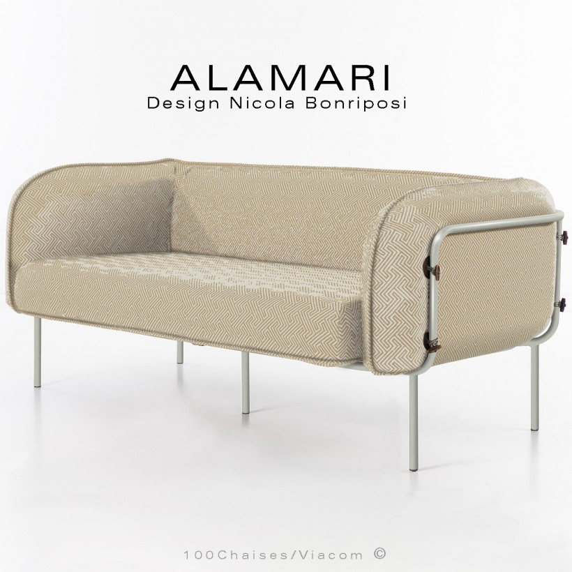 Canapé deux places large lounge ou salon de jardin à usage extérieur ALAMARI, structure tube d'acier 30 mm., avec tampons plastique de protection des sols. Finition structure, peint avec des poudres polyester thermodurcissables, couleurs standard blanc perle ou bronze (autre sur commande et devis voir palette fabricant). Assise avec ceinture élastique, deux coussins inclus assise et dossier enduits à l'intérieur d'une couche de PVC, ce qui le rend imperméable, tout en laissant respirer la mousse polyuréthane haute densité intérieur, afin de lutter contre la formation de moisissures. Habillage coussin tissu housse déhoussable. Option possible coussin supplémentaire (sur demande à commandes@100chaises.fr).