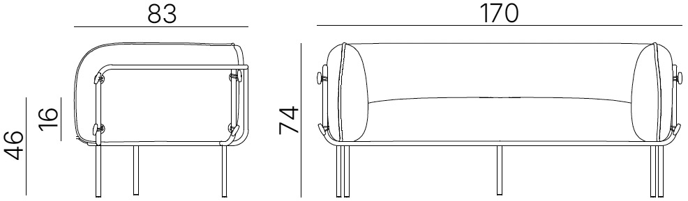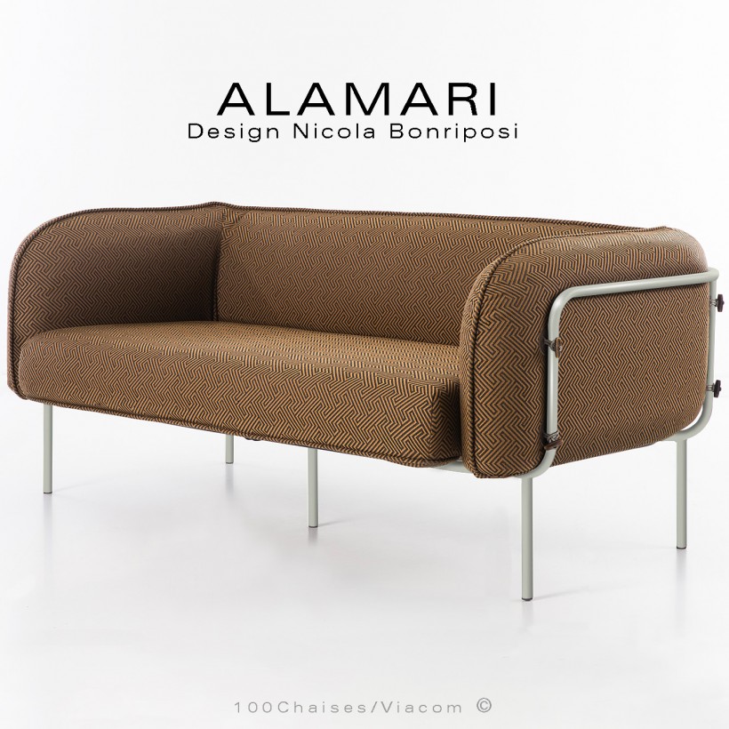 Canapé deux places large lounge ou salon de jardin à usage extérieur ALAMARI, structure tube d'acier 30 mm., avec tampons plastique de protection des sols. Finition structure, peint avec des poudres polyester thermodurcissables, couleurs standard blanc perle ou bronze (autre sur commande et devis voir palette fabricant). Assise avec ceinture élastique, deux coussins inclus assise et dossier enduits à l'intérieur d'une couche de PVC, ce qui le rend imperméable, tout en laissant respirer la mousse polyuréthane haute densité intérieur, afin de lutter contre la formation de moisissures. Habillage coussin tissu housse déhoussable. Option possible coussin supplémentaire (sur demande à commandes@100chaises.fr).