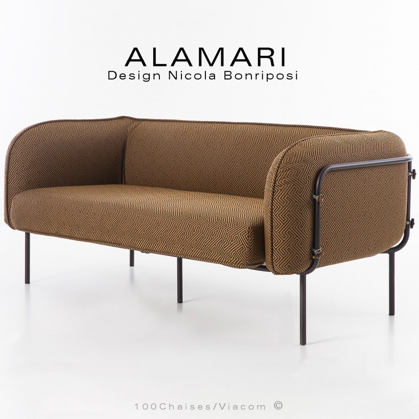 Canapé deux places large lounge ou salon de jardin à usage extérieur ALAMARI, structure tube d'acier 30 mm., avec tampons plastique de protection des sols. Finition structure, peint avec des poudres polyester thermodurcissables, couleurs standard blanc perle ou bronze (autre sur commande et devis voir palette fabricant). Assise avec ceinture élastique, deux coussins inclus assise et dossier enduits à l'intérieur d'une couche de PVC, ce qui le rend imperméable, tout en laissant respirer la mousse polyuréthane haute densité intérieur, afin de lutter contre la formation de moisissures. Habillage coussin tissu housse déhoussable. Option possible coussin supplémentaire (sur demande à commandes@100chaises.fr).
