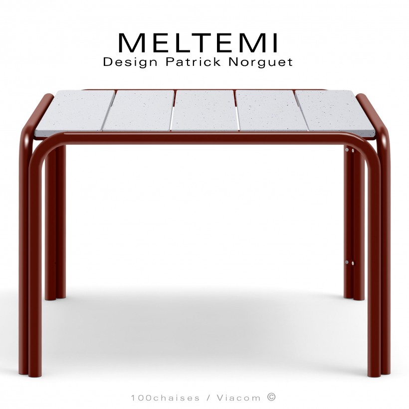 Découvrez la table de jardin carré MELTEMI, alliant élégance et robustesse grâce à sa structure en aluminium peint et son plateau en lamelles émaillées disponible en plusieurs couleurs (option possible sur demande plateau en grès cérame). Son design contemporain est renforcé par un piétement en forme de U renversé, offrant une stabilité optimale et un style épuré. Chaque pied se compose de 2 tubes qui se rejoignent, formant un double piétement solide et esthétique. Le tube supérieur cerclé vient épouser les angles arrondis du plateau, pour un rendu à la fois moderne et résistant.
