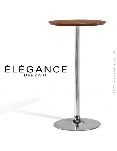 Table mange-debout ÉLÉGANCE, pour café, bistrot, hôtel, snack. Piétement colonne centrale tube d'acier Ø50 mm., platine de sol type trompette ou tulipe Ø500 mm., en acier tourné. Finition peinture polyester au choix ou chromé brillant. Avec tampons de protection des sols. Plateaux type MDF, épaisseur 23 mm., avec chant incliné à 45° sous plateau, finition peinture + vernis 20% de brillance, voir palette couleur au choix ou autre dans la gamme RAL ou échantillon.