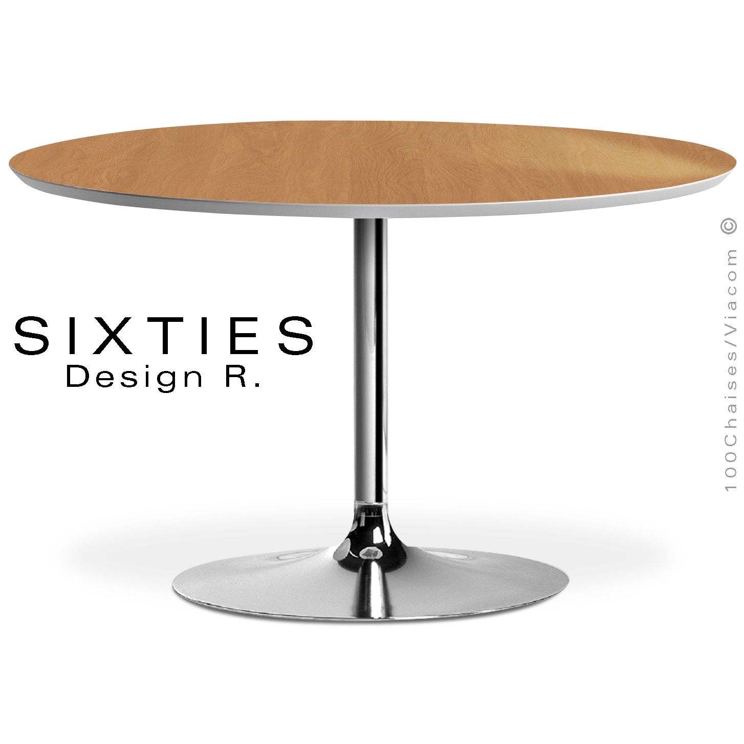 Normes européennesTable ronde design SIXTIES, pour salle à manger ou CHR ou table de travail au bureau. Piétement colonne centrale type trompette ou tulipe en acier tourné, base piètement Ø700 mm., colonne centrale tube d'acier Ø60 mm., finition peinture polyester blanc et noir mat ou brillant, gris-argent, gris foncé, taupe mat (autre couleur voir palette peinture acier sur demande). Avec tampons plastiques de protection des sols. Plateau type MDF, épaisseur 23 mm., finition placage stratifié HPL au choix voir palette fabricant (autre sur demande à commandes@100chaises.fr). Avec inserts négatif sous plateau afin de faciliter le montage. Chant incliné à 45° sous le plateau de couleur noir ou blanc. Dimensions plateaux Ø1100, 1200 ou 1300 mm.