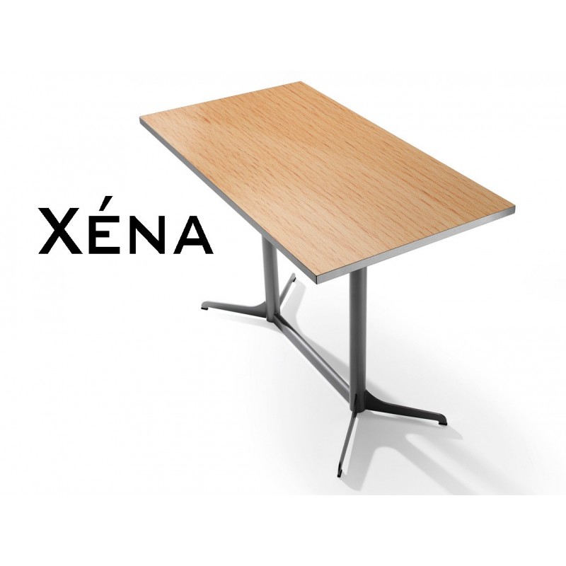 Table pour café, bistrot rectangulaire XÉNA, piétement 4 branches acier plat, épaisseur 6 mm., 2 colonnes tube d'acier Ø50 mm., finition peinture argent RAL-9006. Plateau aggloméré épaisseur 23 mm., plaquage stratifié couleur au choix, chant plateau 90°, ABS inox. Dimensions plateaux : 110x60 - 120x70 - 120x80 cm. - Déclinable en mange debout hauteur 110 cm., Vos demandes commandes@100chaises.fr