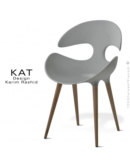Chaise design KAT, coque plastique couleur gris, piétement bois massif de hêtre conique vernis wengé (foncé).