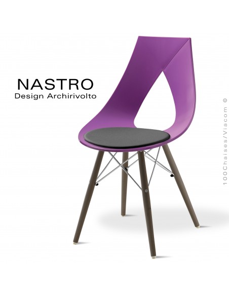 Chaise design NASTRO, assise coque plastique en "Restylon", monobloc, teinté dans la masse. Couleurs noir, blanc, anthracite, taupe, violet et vert pomme. Option coussin d'assise aspect cuir synthétique, gamme Ginkgo du fabricant Griffine, composition 85% PVC, 15% coton. épaisseur 1,3 mm. Certification feu M1 (NFP 92503), AM 18 (NFD 60-013), EN 1021.1-2. Couleur coussin en standard anthracite (autre sur demande voir gamme fabricant). Petite structure sous l'assise en fil d'acier peint noir mat-3015 ou chromé brillant. Piétement 4 pieds en bois de hêtre massif légèrement conique, finition vernis naturel, blanchi ou Wengé avec tampons plastiques de protections des sols - Lot de 2 pièces.