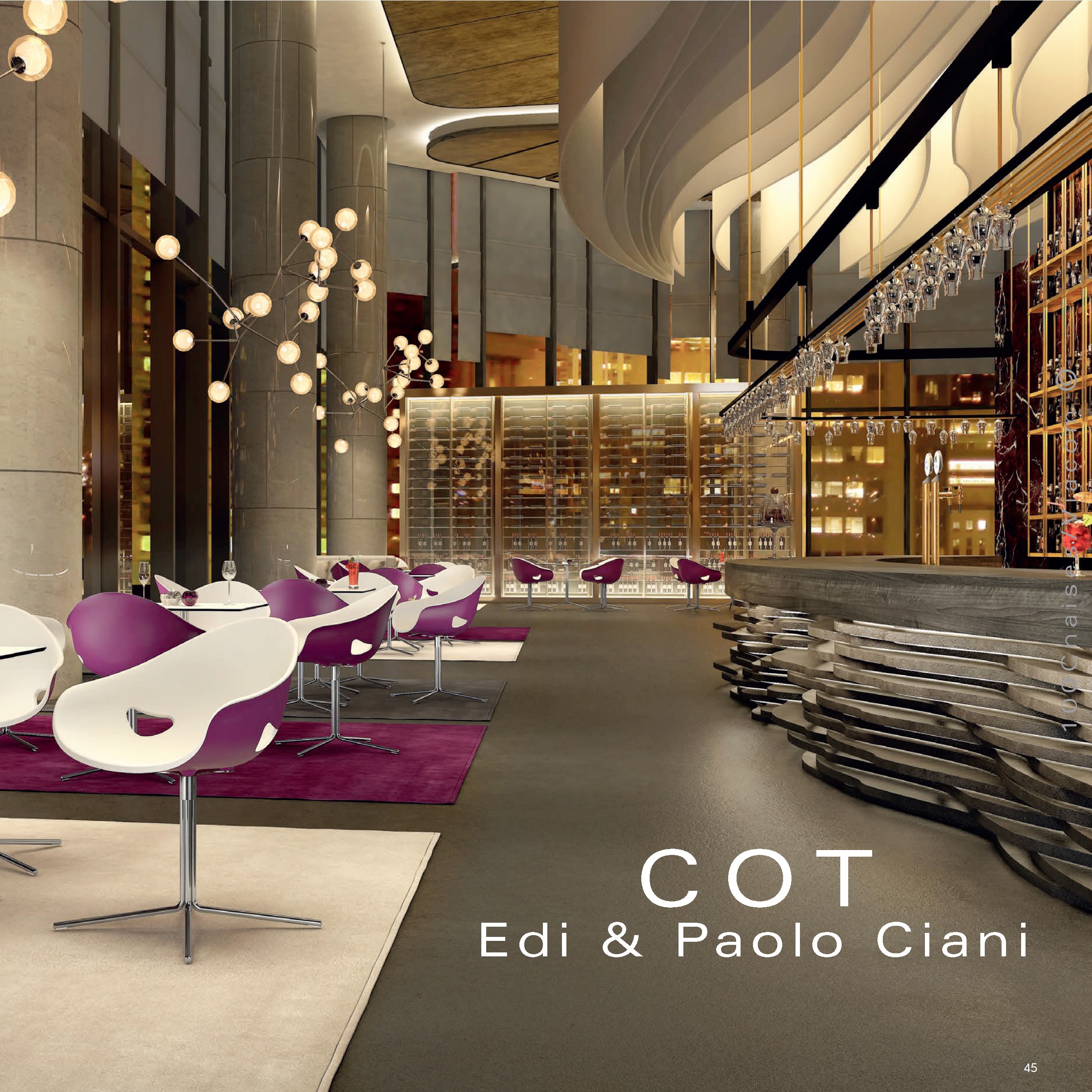 Fauteuil design COT, assise pivotante 360° ou fixe, coque plastique en polypropylène monobloc teinté dans la masse. Couleur assise blanche ou noir, dos ou arrière couleur blanche, noire, rouge ou prune au choix. Piétement 4 branches sur colonne centrale en tube d'acier Ø16 mm., terminaison 4 branches, finition peinture époxy Argent-Gris, noir, blanc ou acier chromé brillant. Avec tampons plastiques de protections des sols.