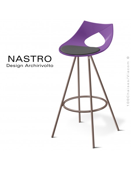Tabouret de bar design NASTRO, assise coque plastique couleur avec coussin, piétement acier peint ou chromé brillant.