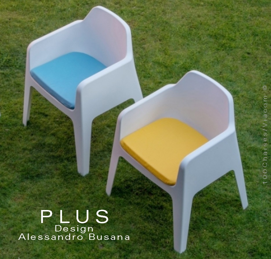 Fauteuil design PLUS, structure monobloc en plastique, entièrement fabriqué en polypropylène, traitement anti UV, teinté dans la masse. Existe en blanc, sable, anthracite, vert militaire, marron, orange. Facile d'entretien et résistant, empilables. Utilisable à l’intérieur et à l’extérieur. Option disponible coussin d'assise mousse + tissu déperlant ou hydrofuge, vos demandes à commandes@100chaises.fr - Lot de 6 pièces.
