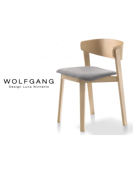 WOLFGANG chaise design en bois, vernis naturel, assise capitonnée couleur gris clair.