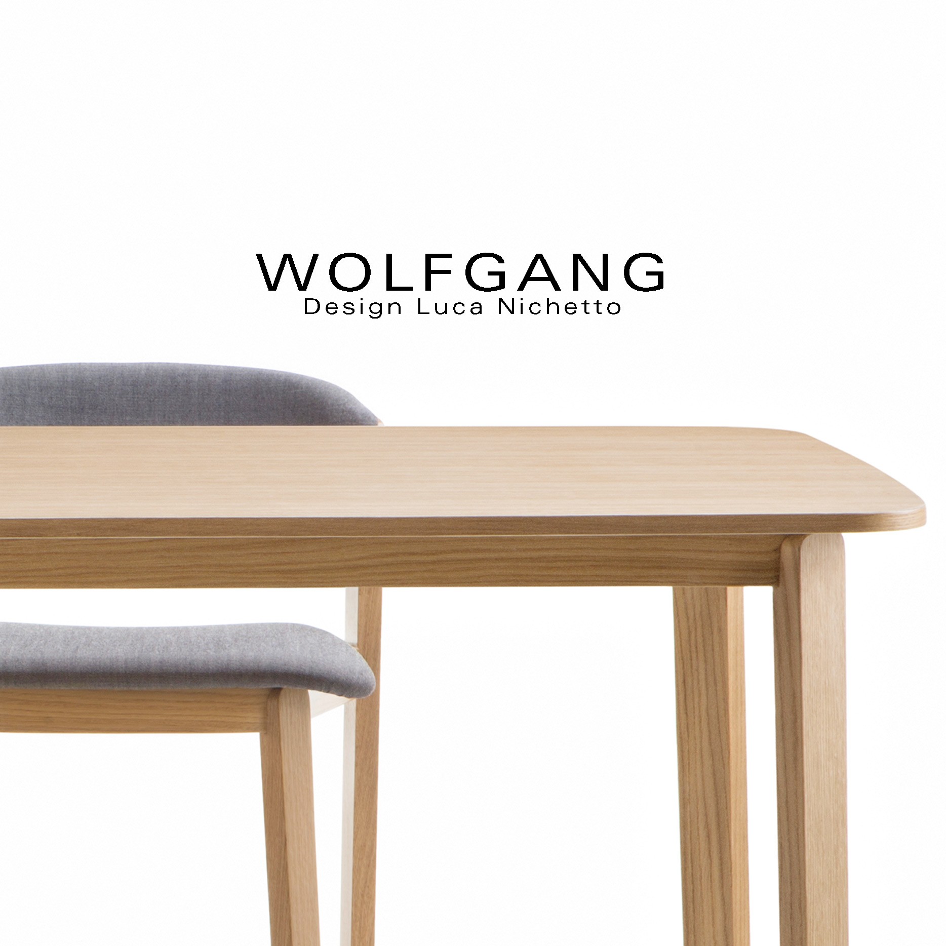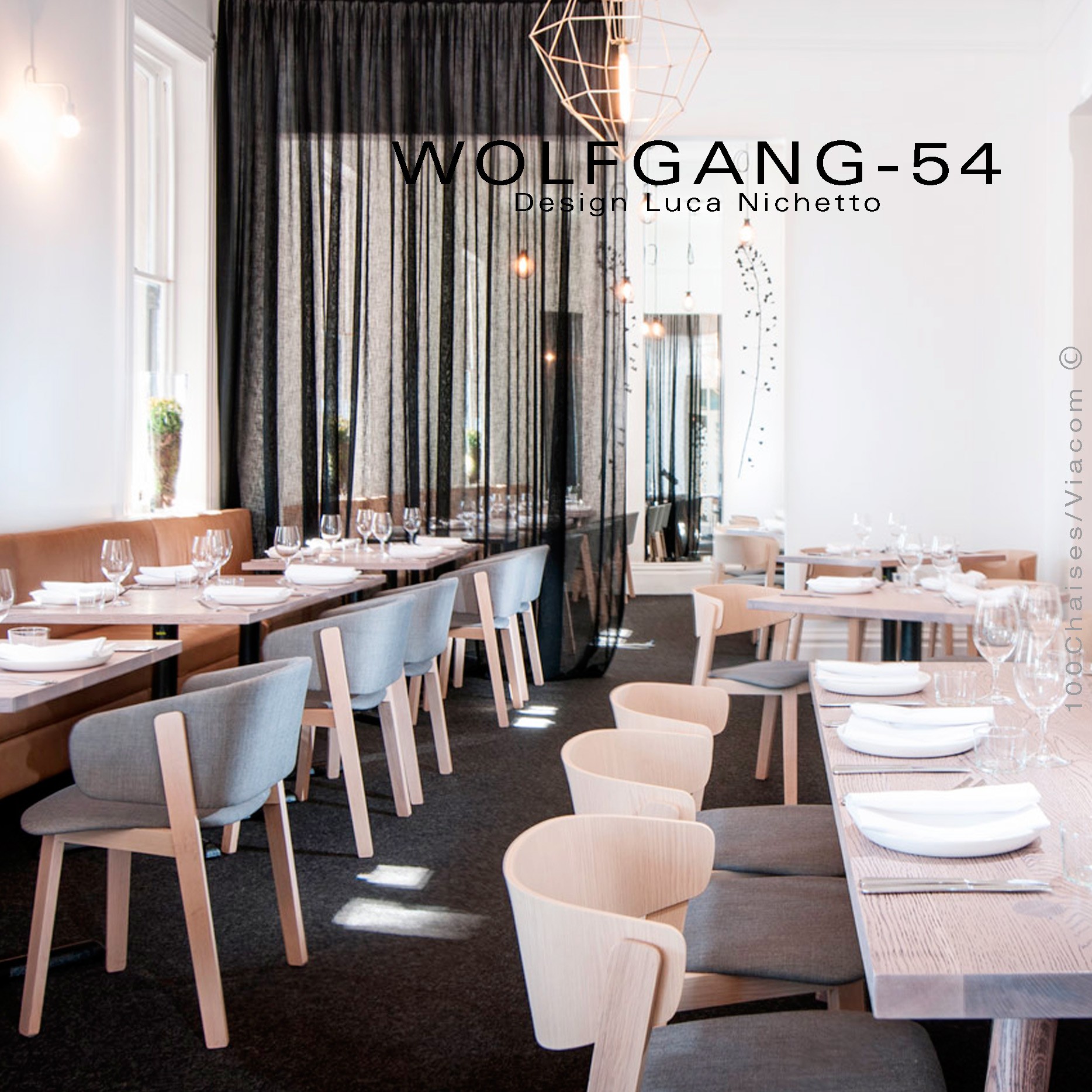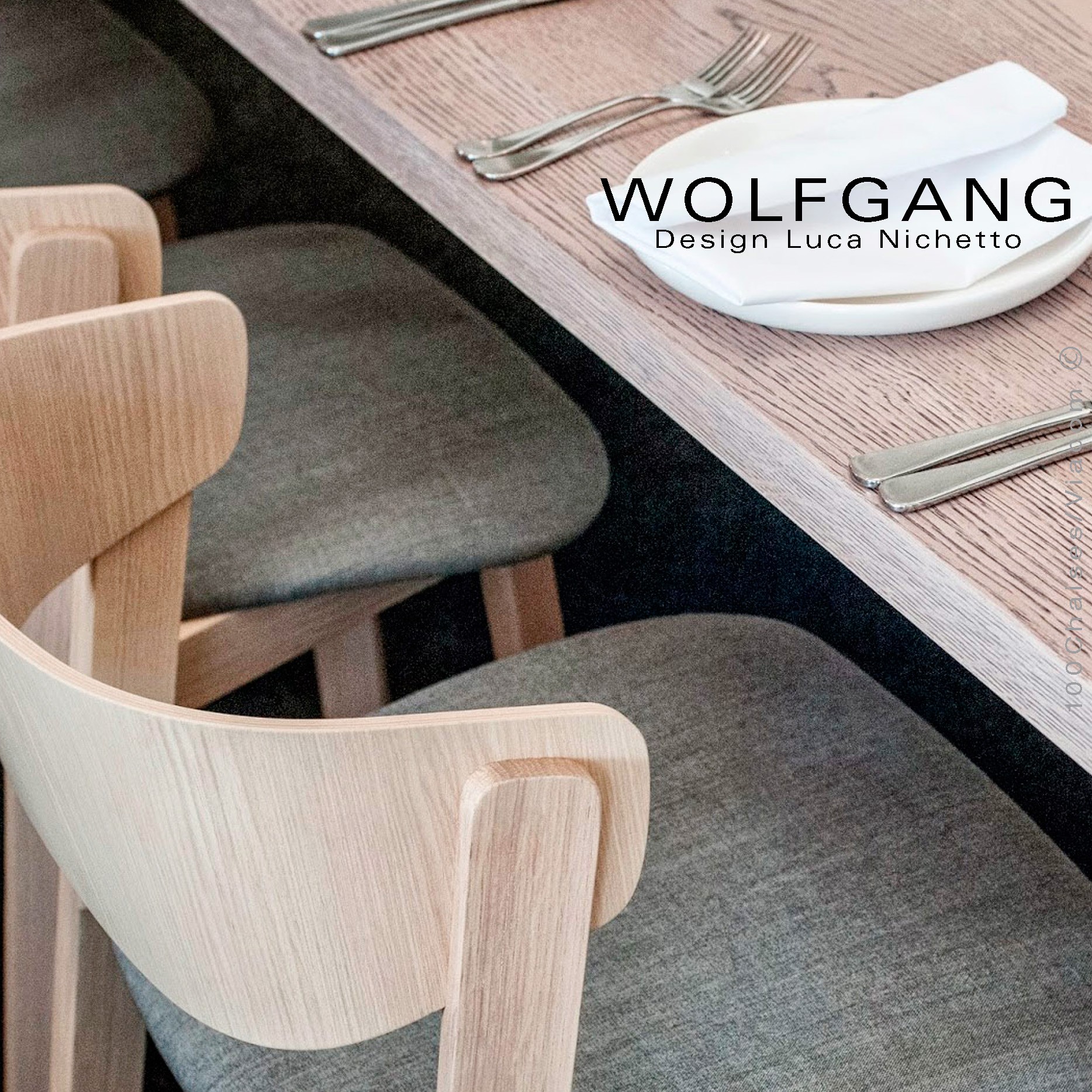 Normes européennesChaise design WOLFGANG en bois de chêne, vernis naturel. Assise garnie de mousse polyuréthane, habillage tissu gamme King-L-Kat du fabricant FIDIVI, 100% fibres de polyester, difficilement inflammable, ne peut être altérée ni par les lavages ni par l’usure. Ignifugé M1 pour la France. Piétement avec tampons de protection des sols. (Si quantité importante vos demandes à commandes@100chaises.fr).