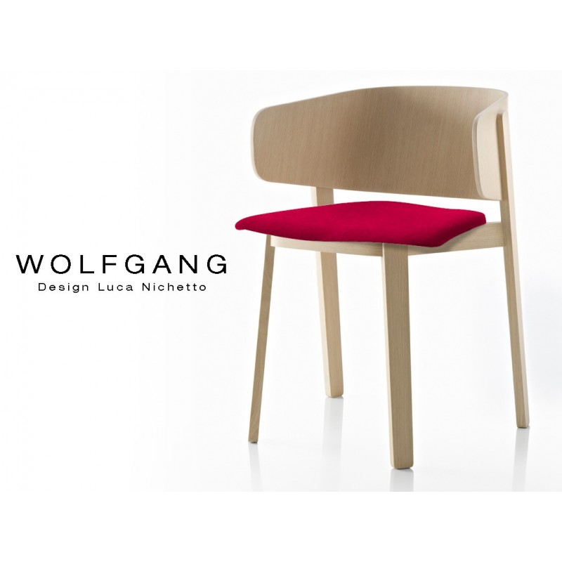 WOLFGANG fauteuil design en bois, vernis naturel, assise capitonnée couleur rouge.