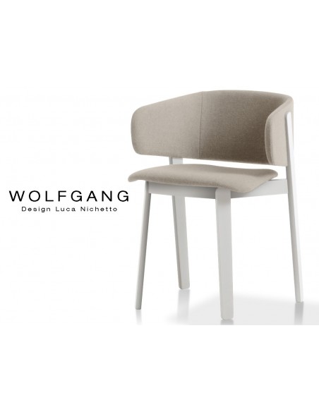 WOLFGANG white fauteuil design bois, capitonné, tissu "Gabriel" gamme Argos2.