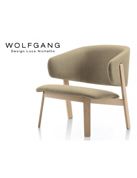 Fauteuil design lounge WOLFGANG piètement bois naturel, assise et dossier garnis, habillage tissu synthétique