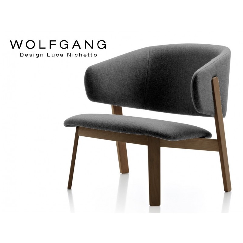 Fauteuil design WOLFGANG lounge, bois de chêne vernis tabac, assise et dossier garnis de mousse polyuréthane, habillage tissu gamme King-L-Kat du fabricant FIDIVI, 100% fibres de polyester, difficilement inflammable, ne peut être altérée ni par les lavages ni par l’usure. Ignifugé M1 pour la France. Tampons de protection des sols. (Si quantité importante vos demandes à commandes@100chaises.fr).