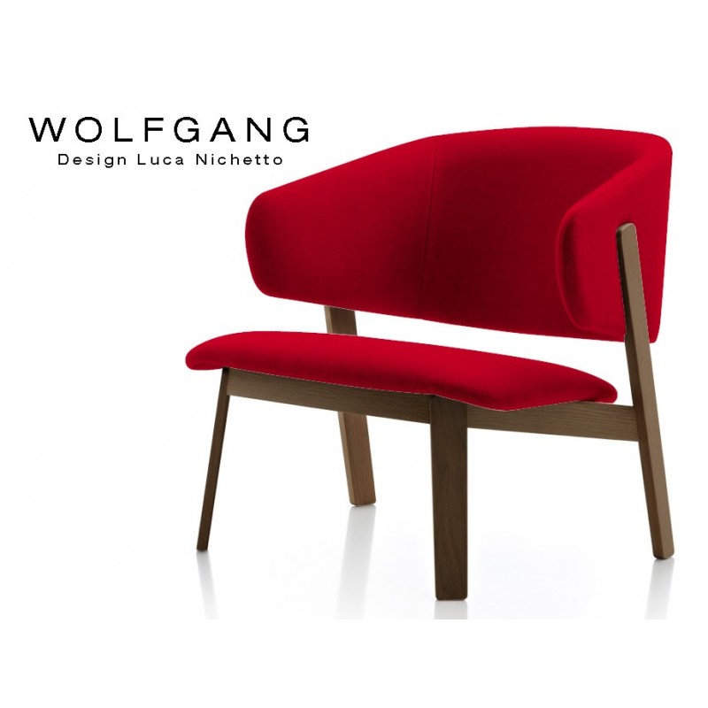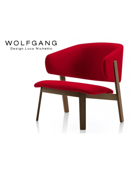 WOLFGANG lounge, fauteuil design bois, finition tabac, assise capitonné rouge.