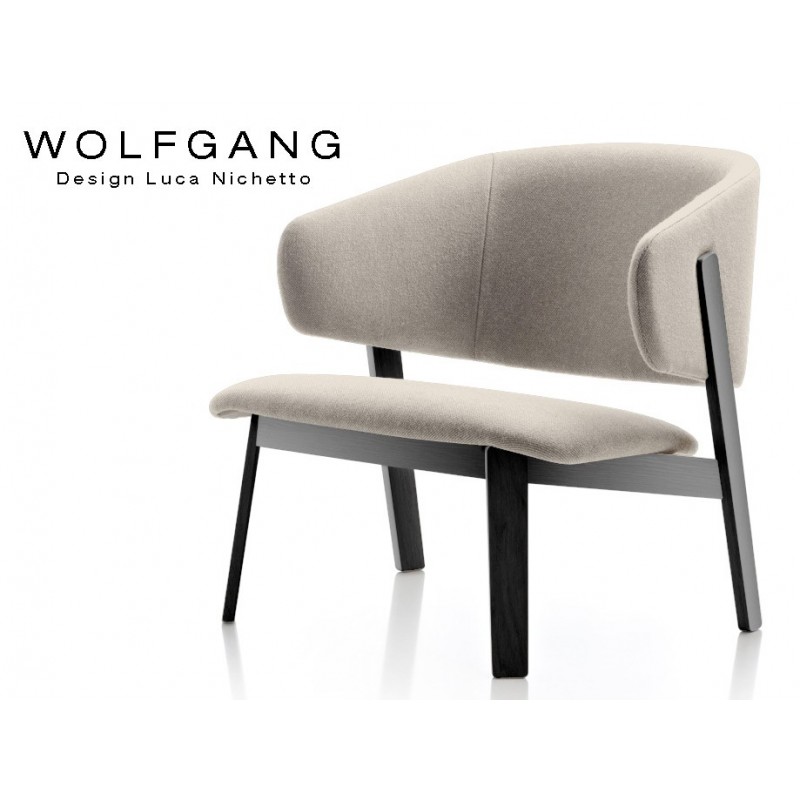 Fauteuil design WOLFGANG lounge, en chêne peint noir. Assise et dossier garnis de mousse polyuréthane, habillage tissu gamme King-L-Kat du fabricant FIDIVI, 100% fibres de polyester, difficilement inflammable, ne peut être altérée ni par les lavages ni par l’usure. Ignifugé M1 pour la France. Tampons de protection des sols. (Si quantité importante vos demandes à commandes@100chaises.fr).