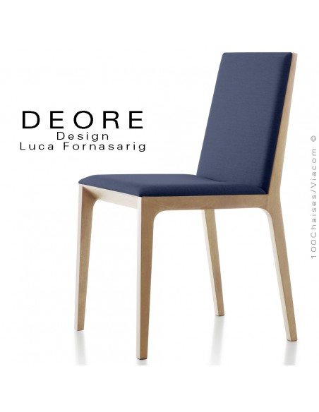 Chaise bois design DEORE, pour CHR, piétement bois de hêtre massif, finition vernis, assise et dossier garnis, habillage tissu.