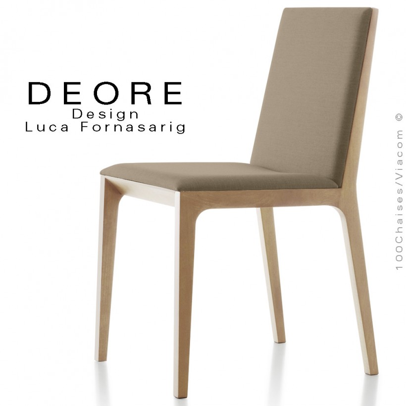 Normes européennesChaise bois design DEORE, structure en bois de hêtre massif, assemblage par tenon et mortaise. Assise et dossier en contreplaqué, garnis de mousse polyuréthane haute densité. Avec tampons plastiques ou nylon feutre pour protection des sols. Finition structure vernis au choix – Naturel – Cerise – Noyer – Acajou – Wengé. Habillage assise et dossier tissu tissé gamme King-L, 100% Polyester-Trévira CS du fabricant Fidivi, ne peut être altérée ni par les lavages ni par l’usure. Ignifugé M1 et AM18. Couleur tissu au choix suivant gamme fabricant. Utilisation en intérieur uniquement.