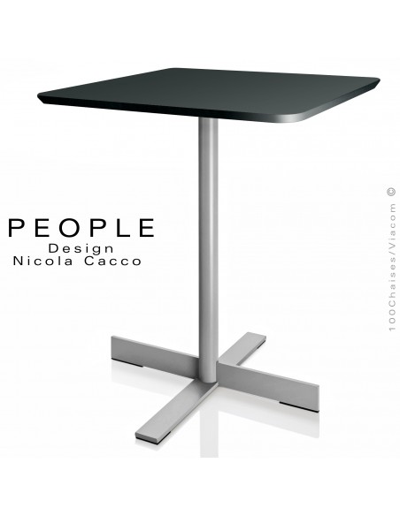 Table ronde ou carré pour hôtel, bar, restaurant, snack PEOPLE, piètement colonne centrale tube d'acier Ø80 mm., piétement base fer plat 4 branches en acier. Finition piétement peinture polyuréthane couleur anthracite, noir, blanc, sable, aluminium. Plateau rond ou carré, type MDF épaisseur 25 mm. avec finition peinture polyuréthane + laque. Option mécanique plateau rabattable et piétement encastrable. Pour intérieur ou terrasse couverte uniquement. Avec tampons plastiques de protection des sols. La table PEOPLE s'intègre aussi bien dans des intérieurs très modernes que plus classiques.